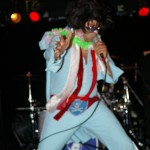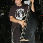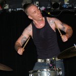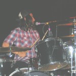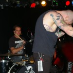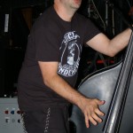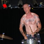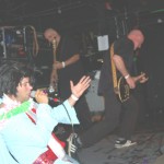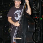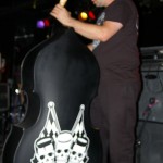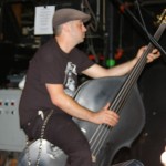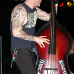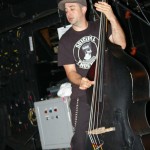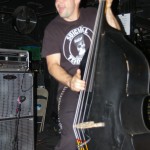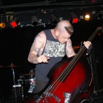 The Chop Tops consists of Sinner, whose name is tattooed on his chest, and who stands behind a drum kit and sings all the songs with wild abandon. I hate to overuse this word, but the guy’s frikkin’ AWESOME! Accompanying him is Shelby on Gretsch guitar. Shelby never stands in one place for more than a few seconds as he bullies his guitar strings while they wail in protest. His Gretsch featured painted black and red spiders splattered on it along with what appeared to be a raccoon tail hanging off the end. There was something about animal tails at this show, but more on that later. The band’s newest member, Brett, took over on upright bass in 2008. He’s the one who holds things down with his steady, slamming and strumming. He rarely moves, although he did raise his upright above his head a couple times. Other than that, he just keeps slapping away. Yet, he’s fascinating to watch and I don’t know why. As energetic and manic as Shelby and Sinner were, I often found my eyes drawn to Brett. Perhaps I expected him at any moment to do something notable like the other two were. Whatever it was, this is a fun band to watch. They’re wild. Any psychobilly fan should check these guys out. You missed a fun show.