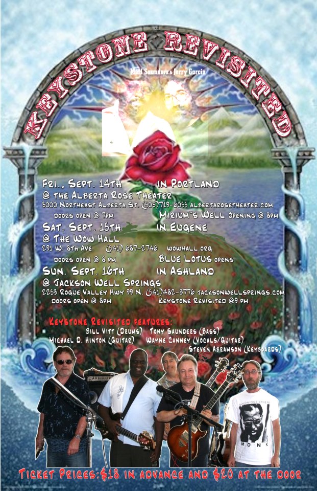 Keystone Revisited will perform at the Alberta Rose Theater in Portland Oregon, Fri. Sept. 14th. Keystone Revisited features the music of Merl Saunders and Jerry Garcia. The band features drummer Bill Vitt, Merl Saunder’s son Tony Saunders on bass, Michael Hinton on guitar, and Steven Abramson on keyboards/vocals. (See graphic below for dates, times and places in Eugene and Ashland.)