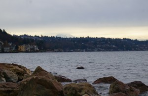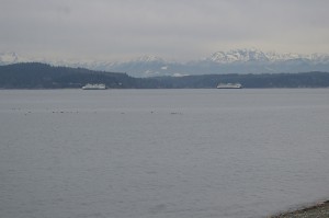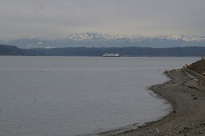 Looking Southwest on Puget Sound while Mt Rainier peeks over the hill