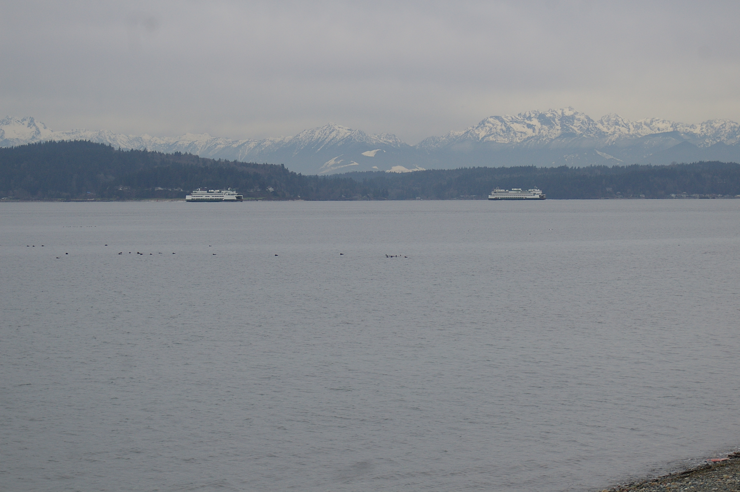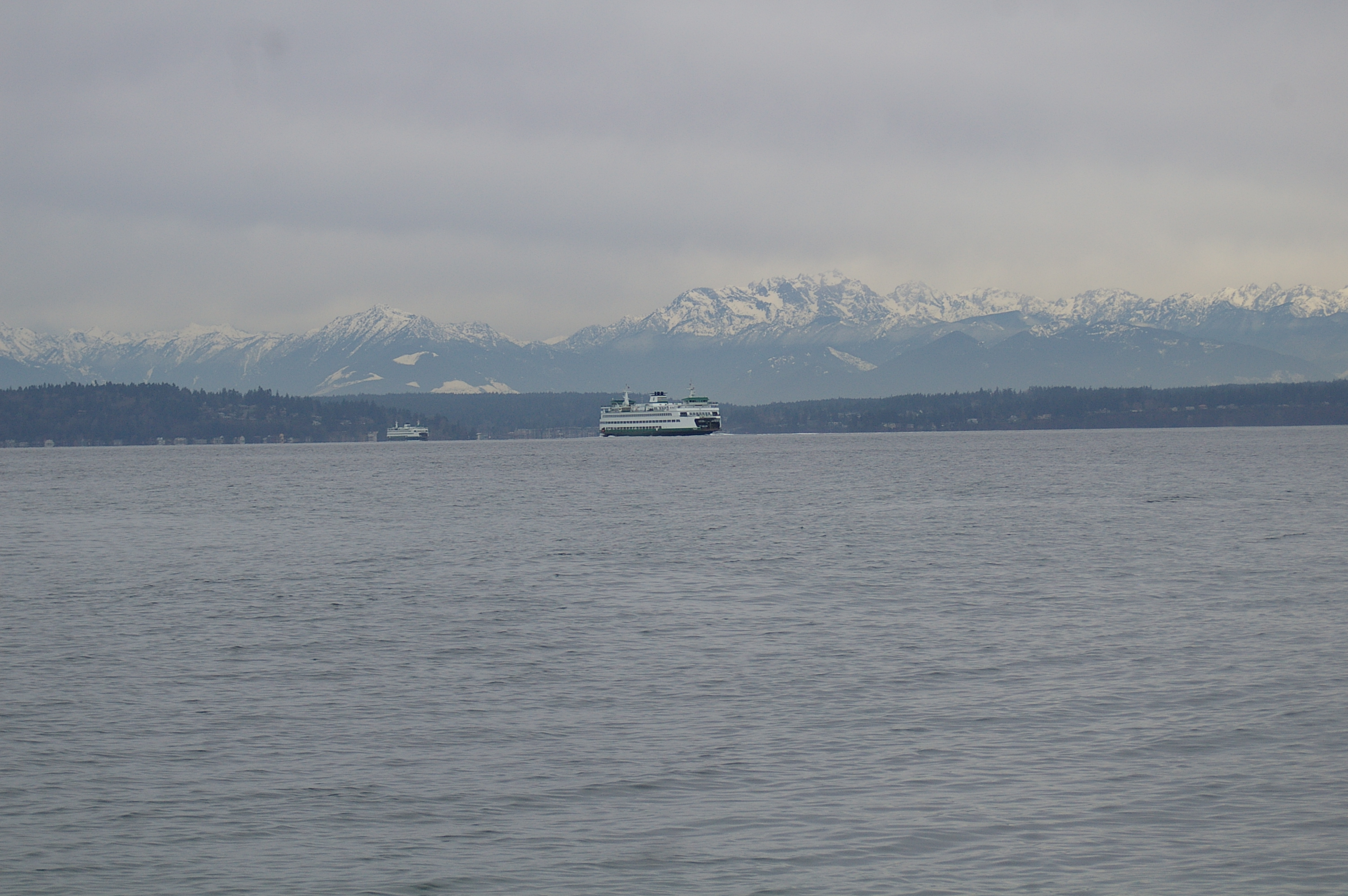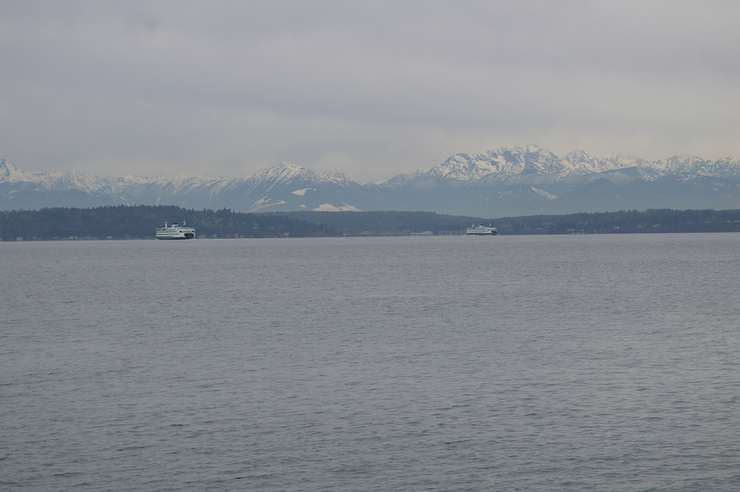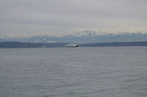 Two passing ferries with the Olympic Mountains in the background