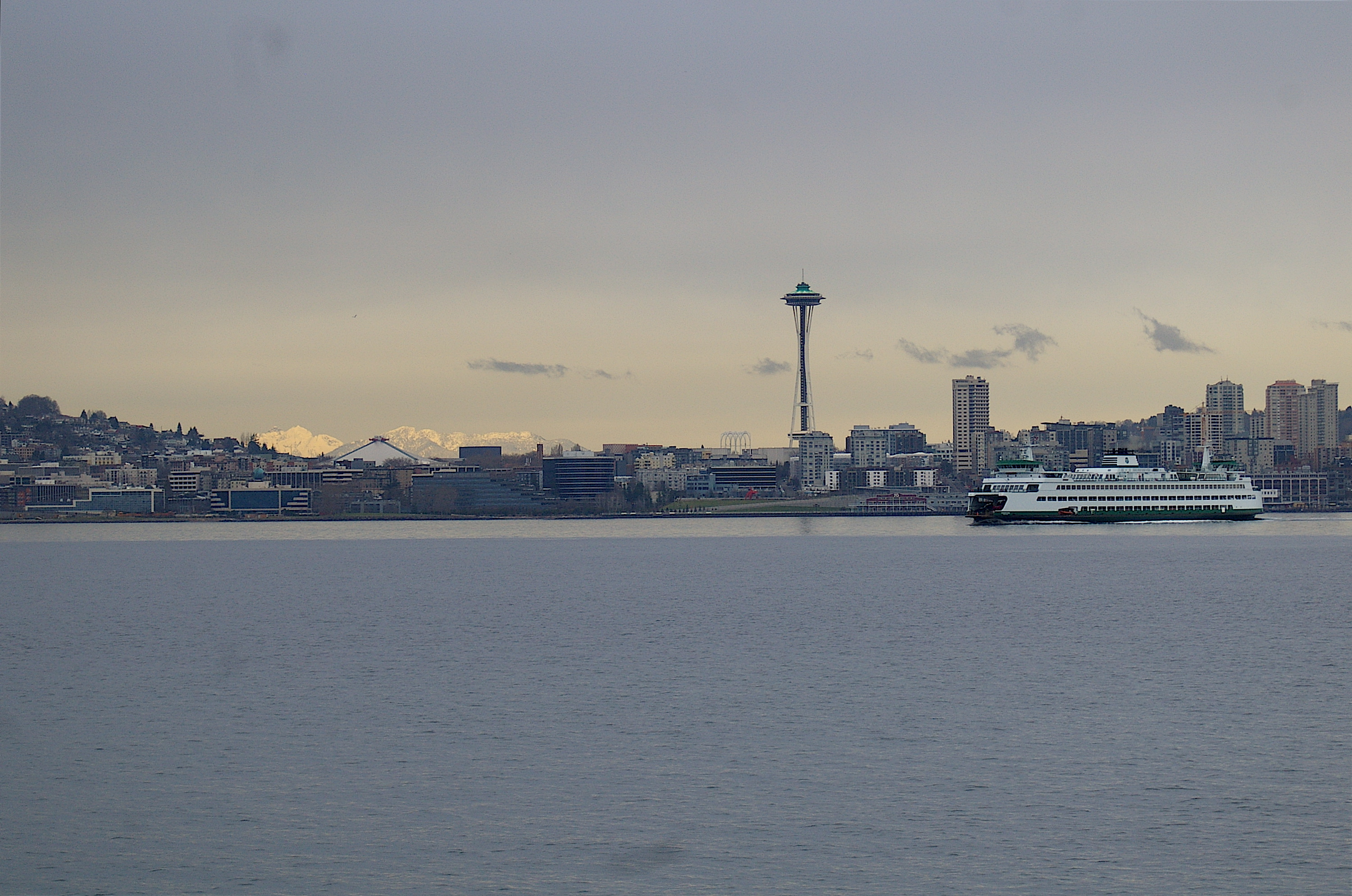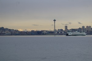 A Washington State Ferry Leaves Port in front of a backdrop of the Space Needle and Cascade Mountains