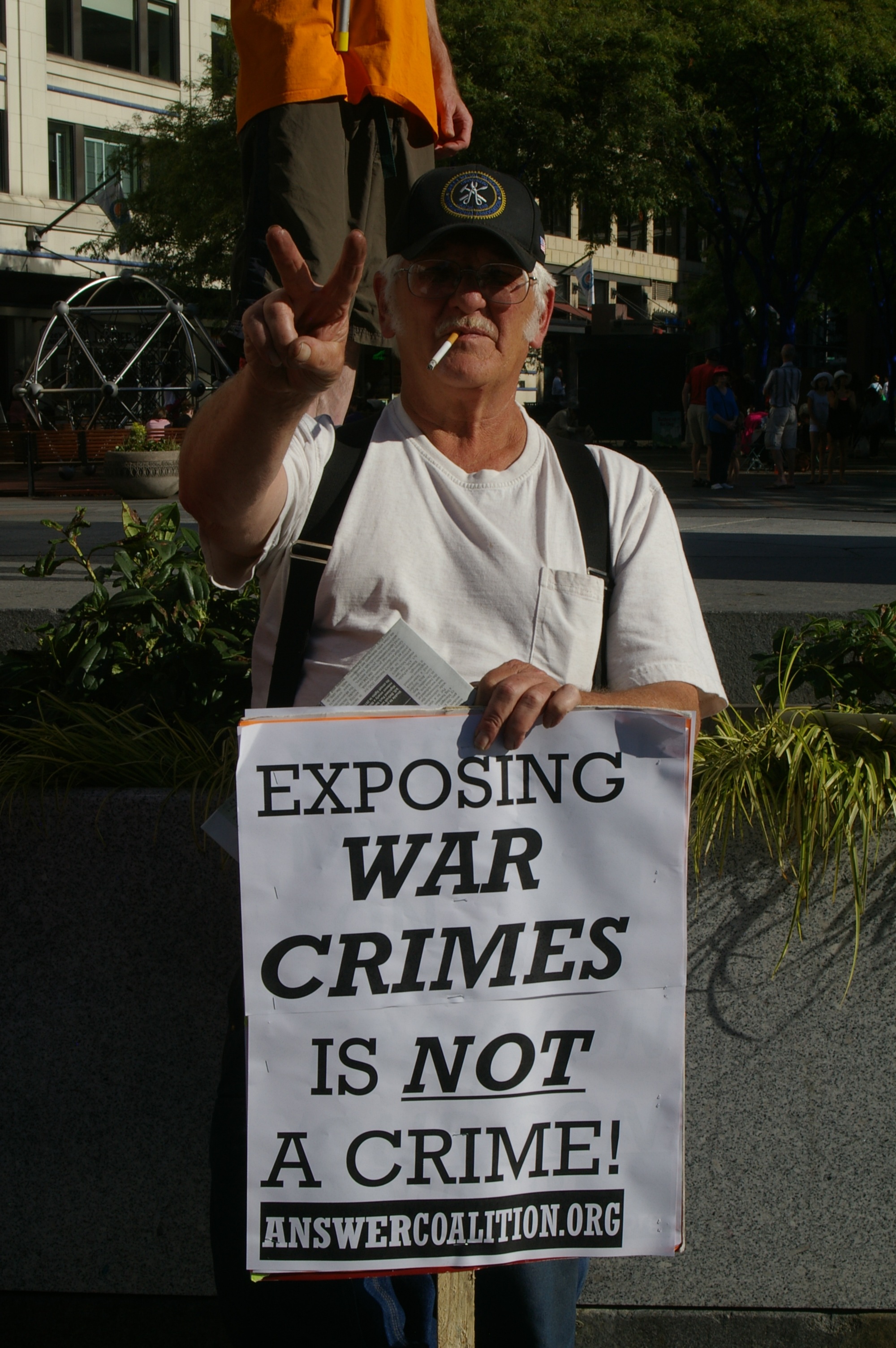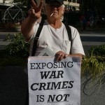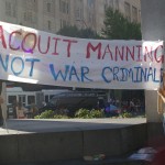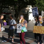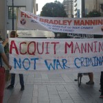 About forty-five people were in attendance for this spur of the moment rally and a few got up and spoke. One such person was in attendance during much of the trial and claimed that Manning wasn’t allowed to turn her head to look at her supporters nor were they allowed to approach her. He also reported that the Taliban is getting stronger, not weaker and that the US is still covering up the killings of innocents through their drone strikes in Afghanistan because US imperialism works better if people are kept in the dark.