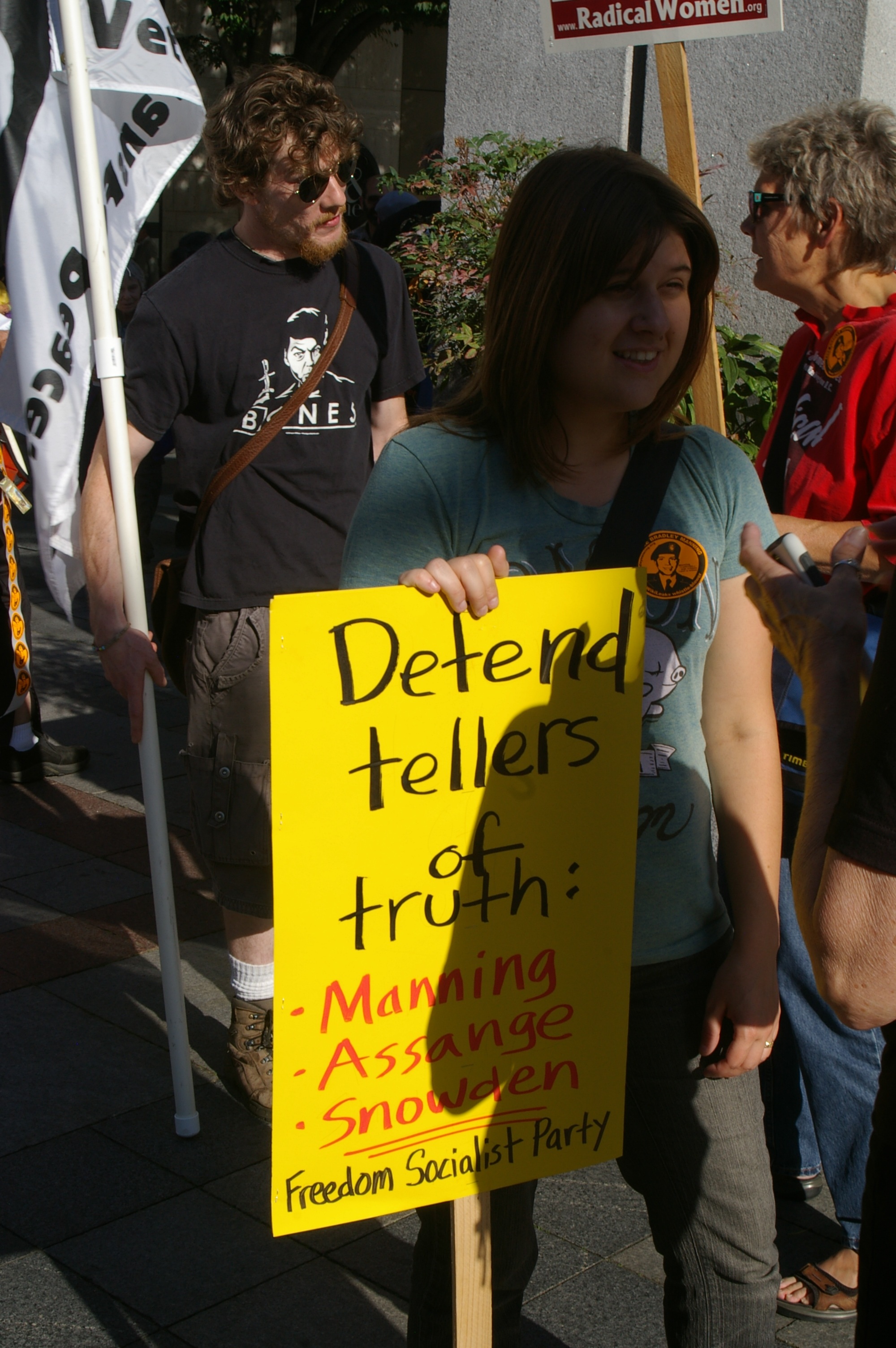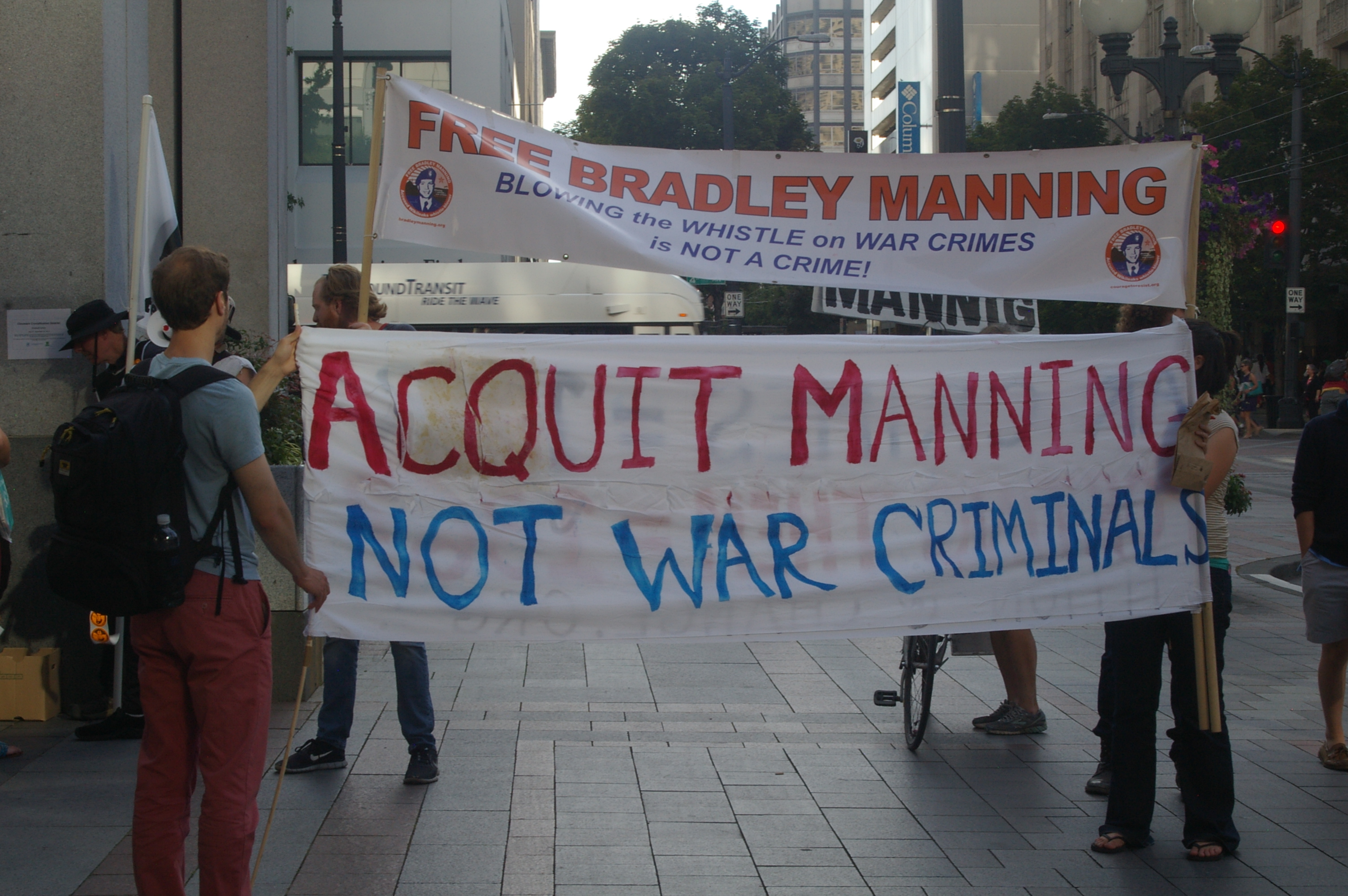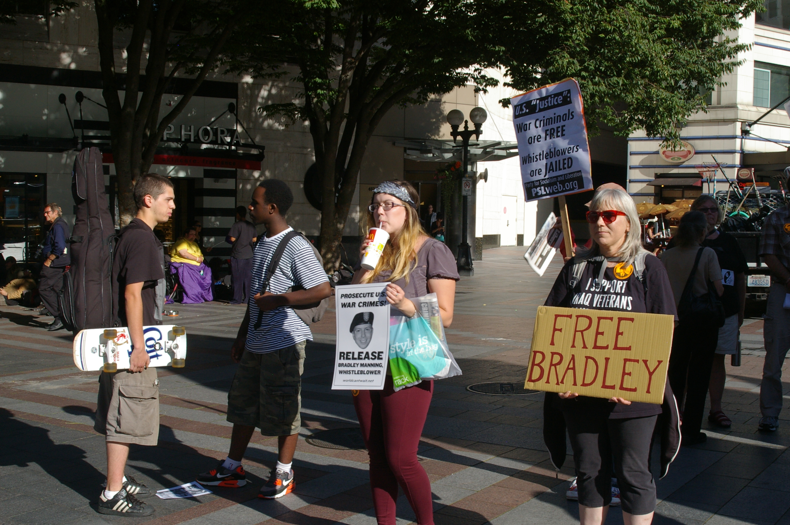 Wednesday evening I joined with others in Seattle’s Westlake Center for a protest rally against the sentencing of a person most know as Bradley Manning (in the last couple days Bradley Manning has decided he wants to undergo a sex change and wishes to be called Chelsea Manning).
