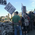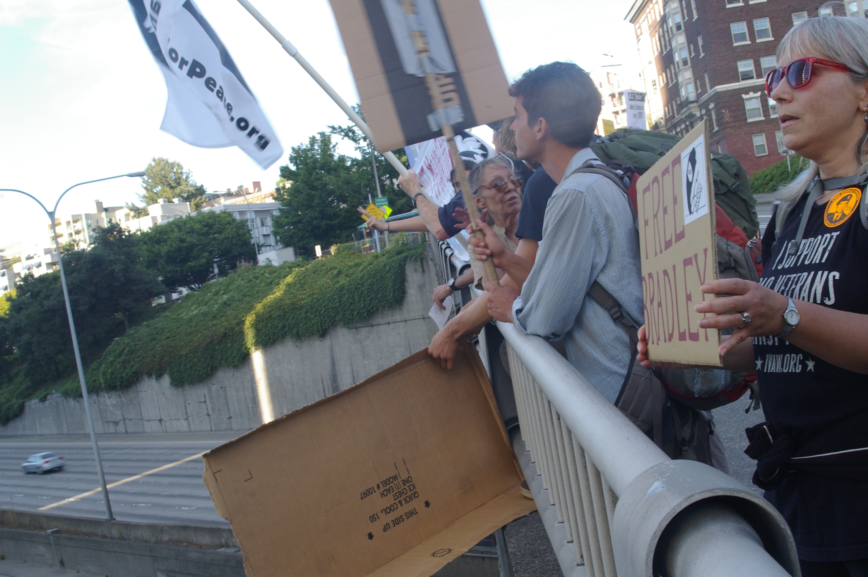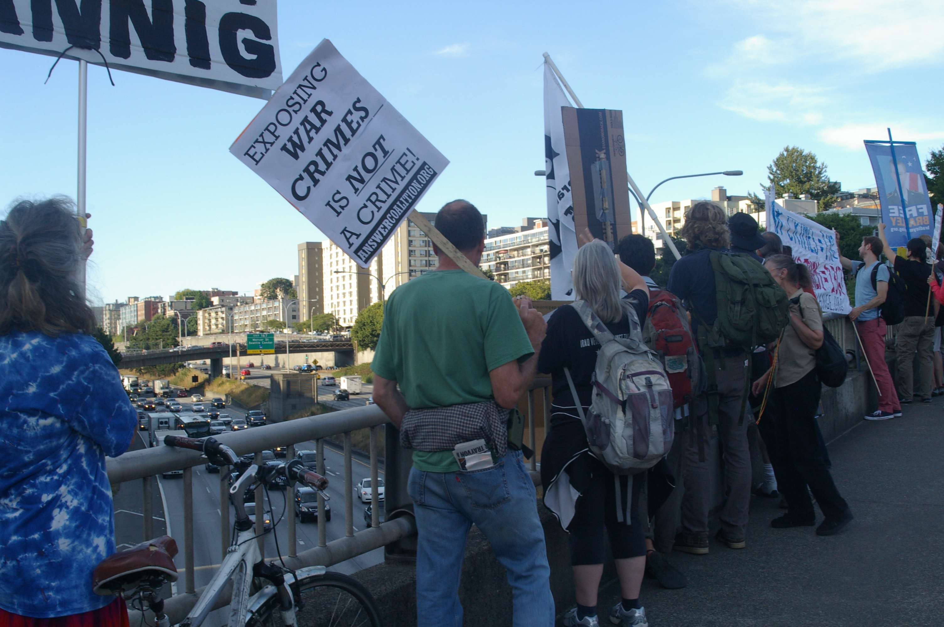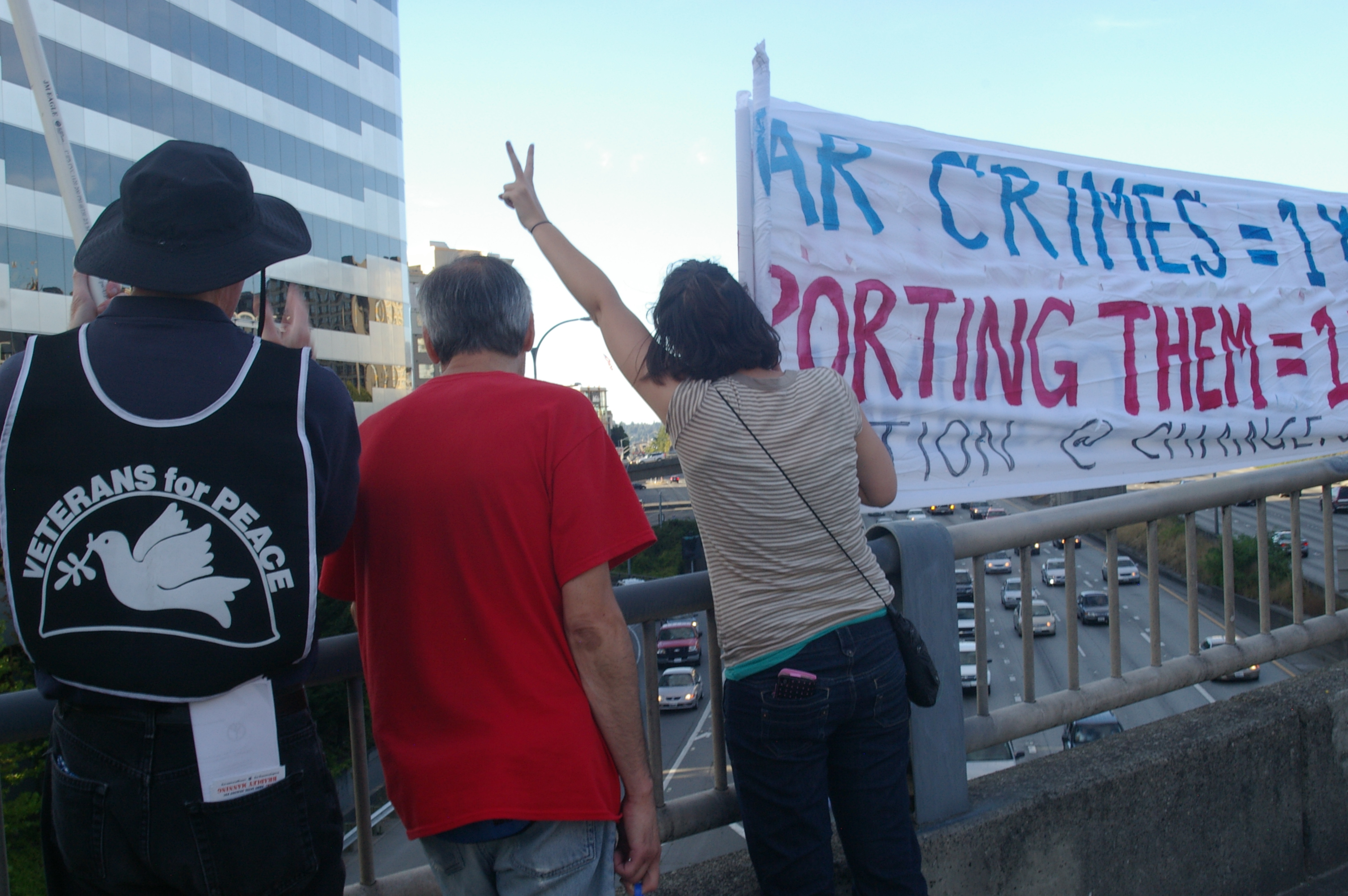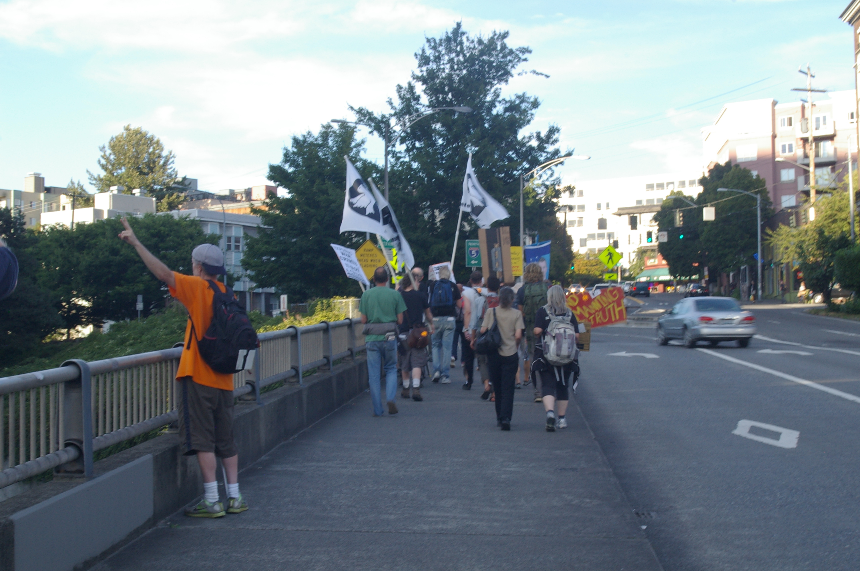 The rally then turned into a march a few blocks away to the nearest freeway (I-5) overpass. This was at the height of rush hour so there was no shortage of motorists out on the highway as well as the streets. Several honked in support as we stood there waving signs and holding up two fingers for peace, before marching up to Capitol Hill where I left the march.
