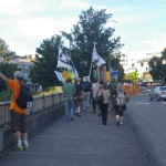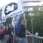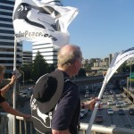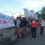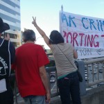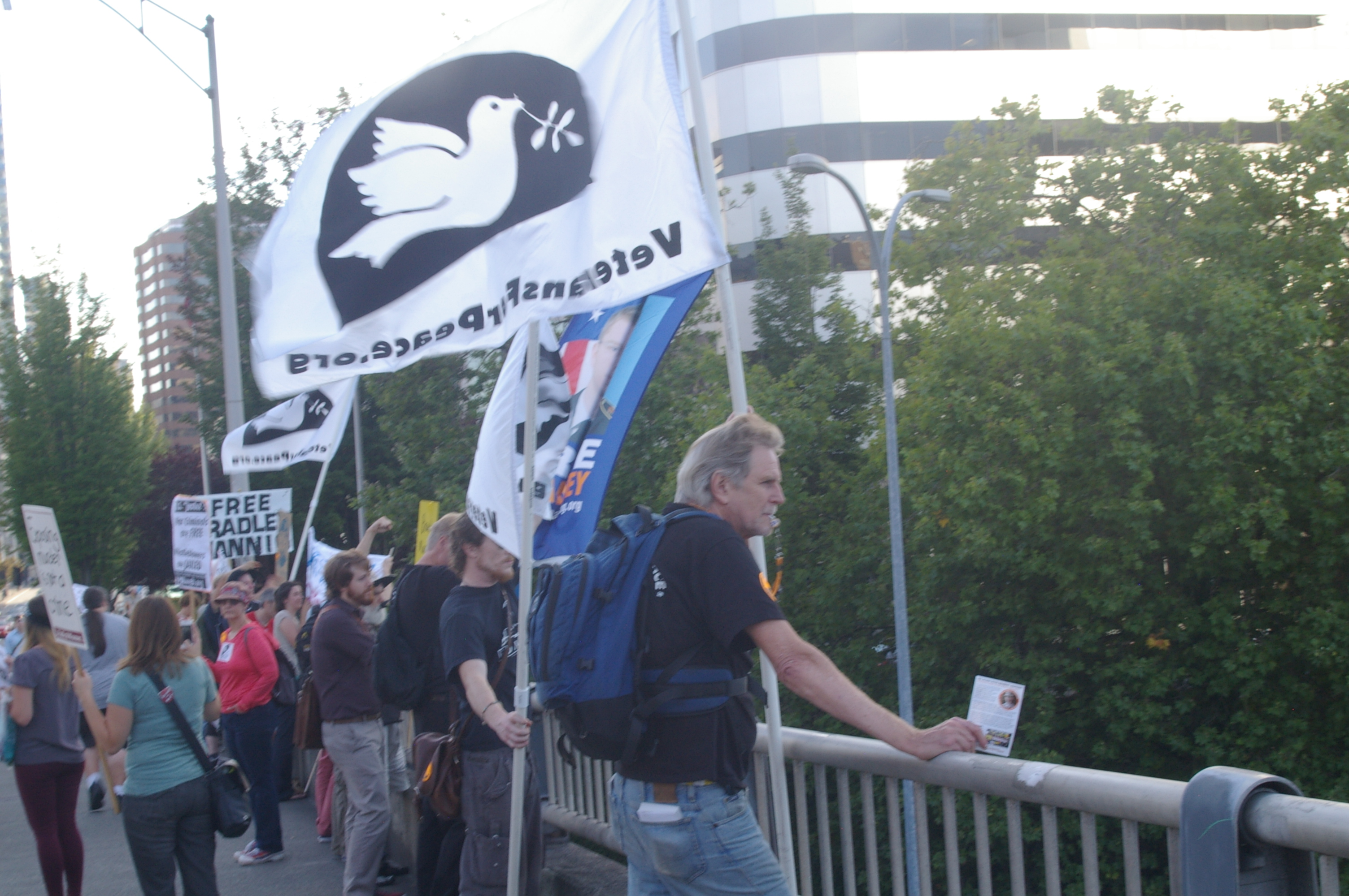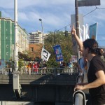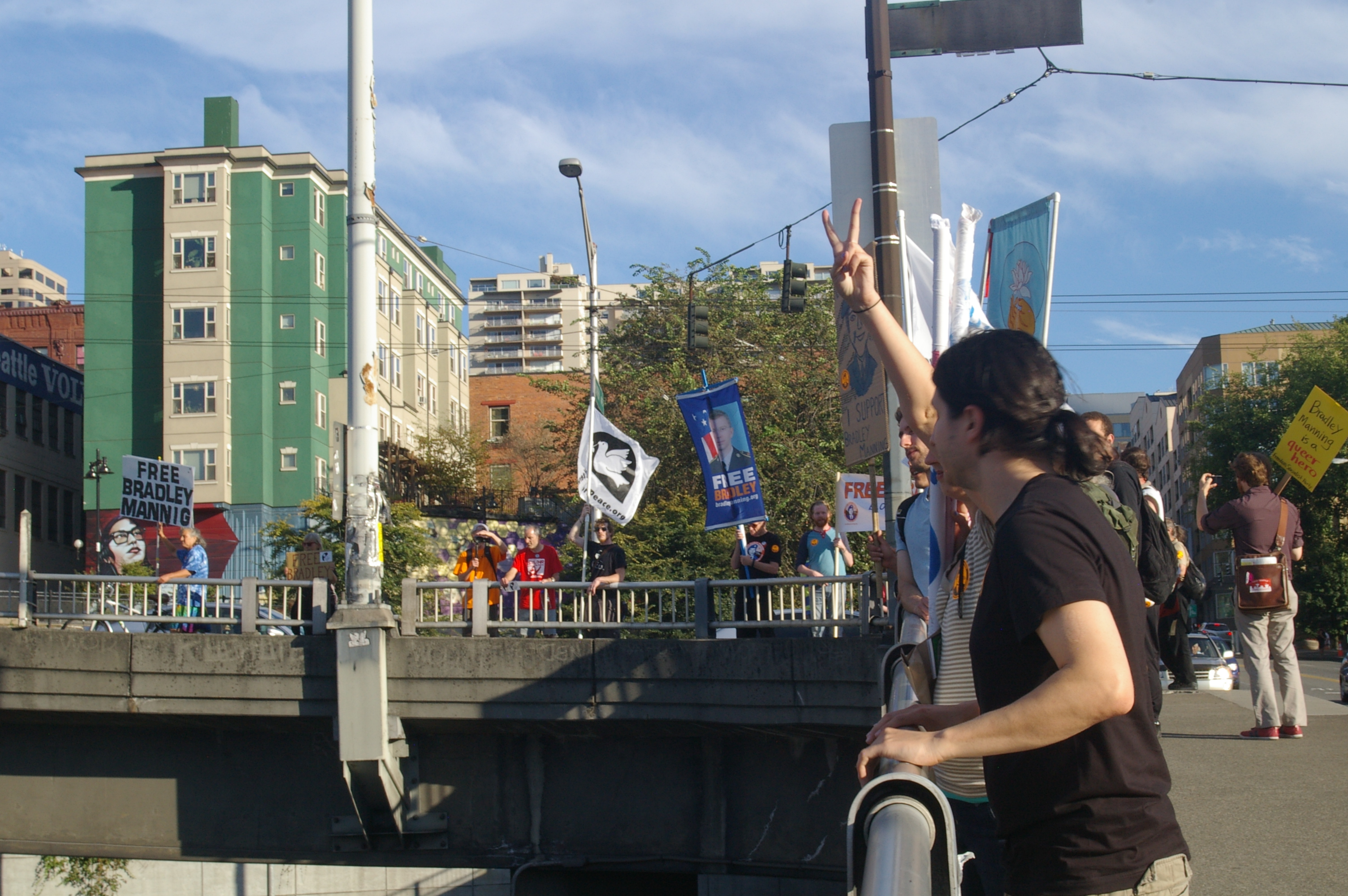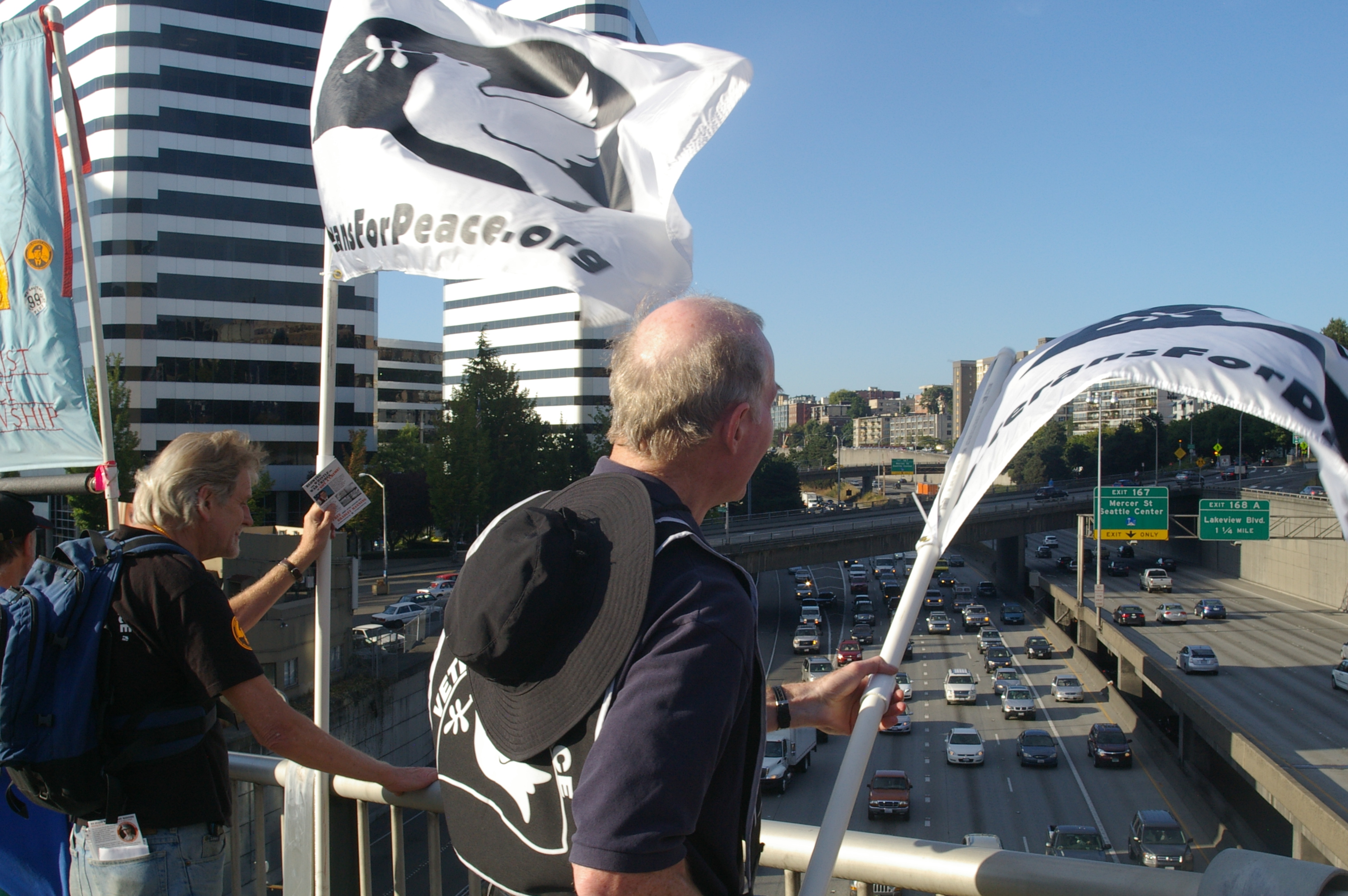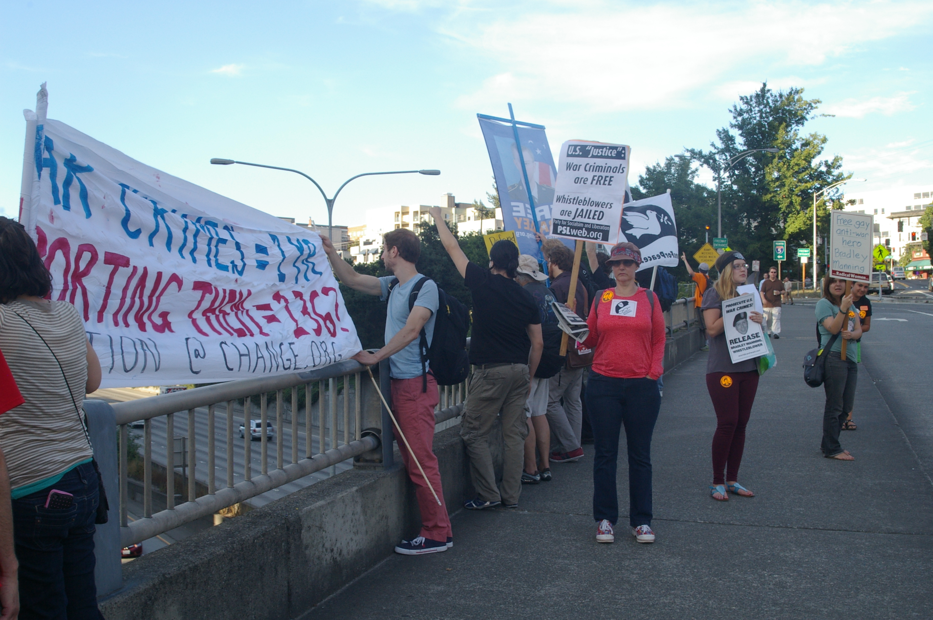 The rally then turned into a march a few blocks away to the nearest freeway (I-5) overpass. This was at the height of rush hour so there was no shortage of motorists out on the highway as well as the streets. Several honked in support as we stood there waving signs and holding up two fingers for peace, before marching up to Capitol Hill where I left the march.