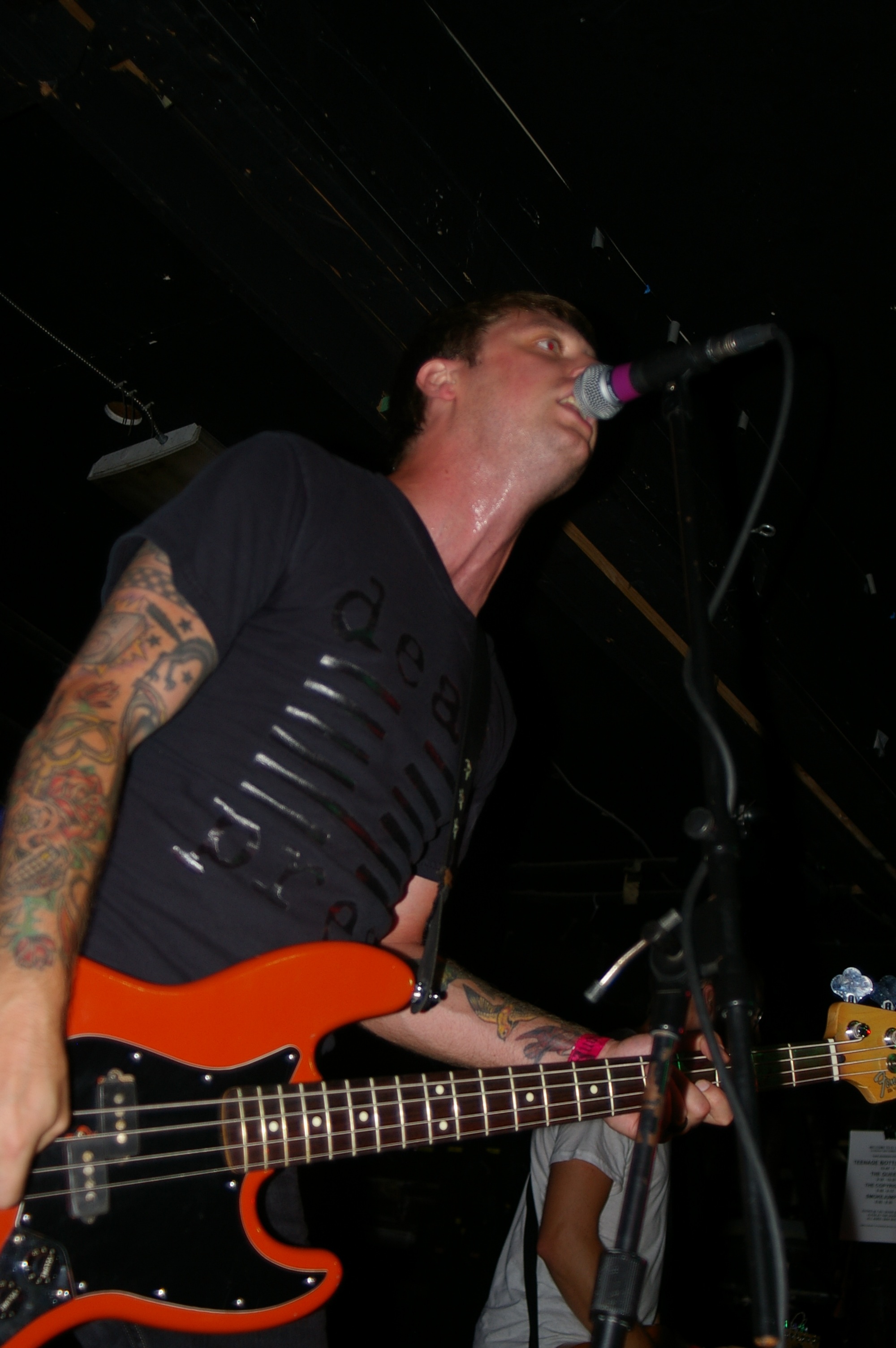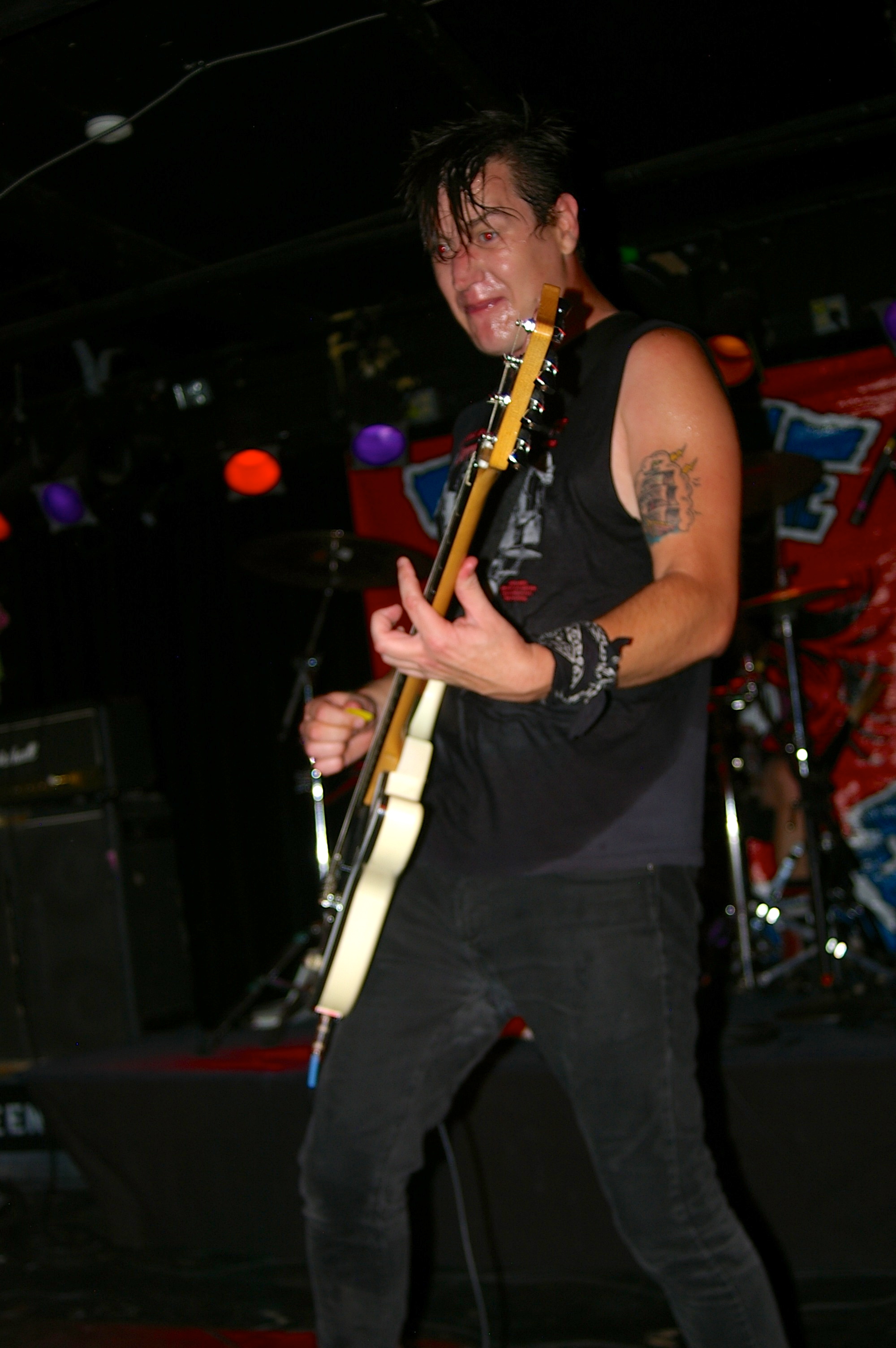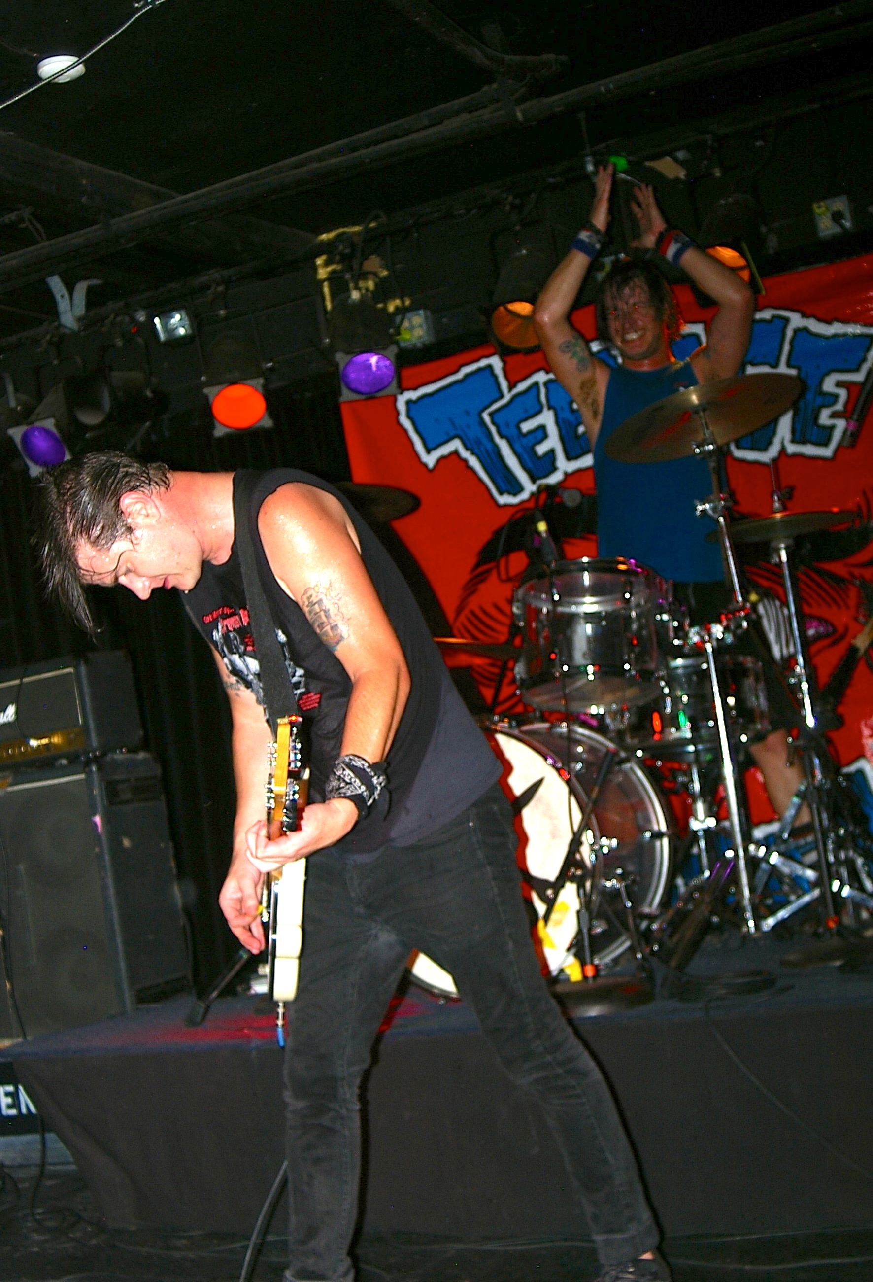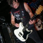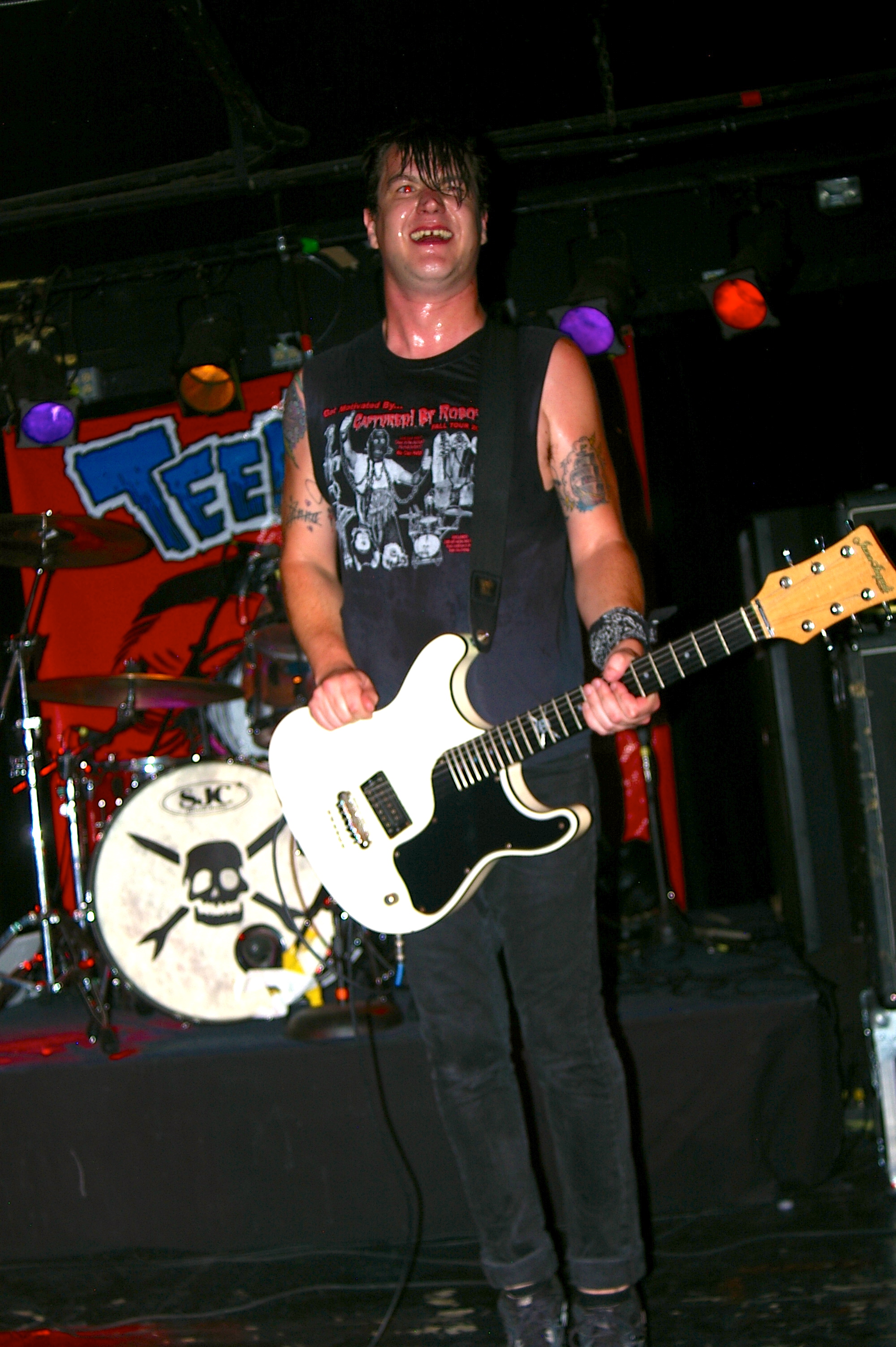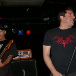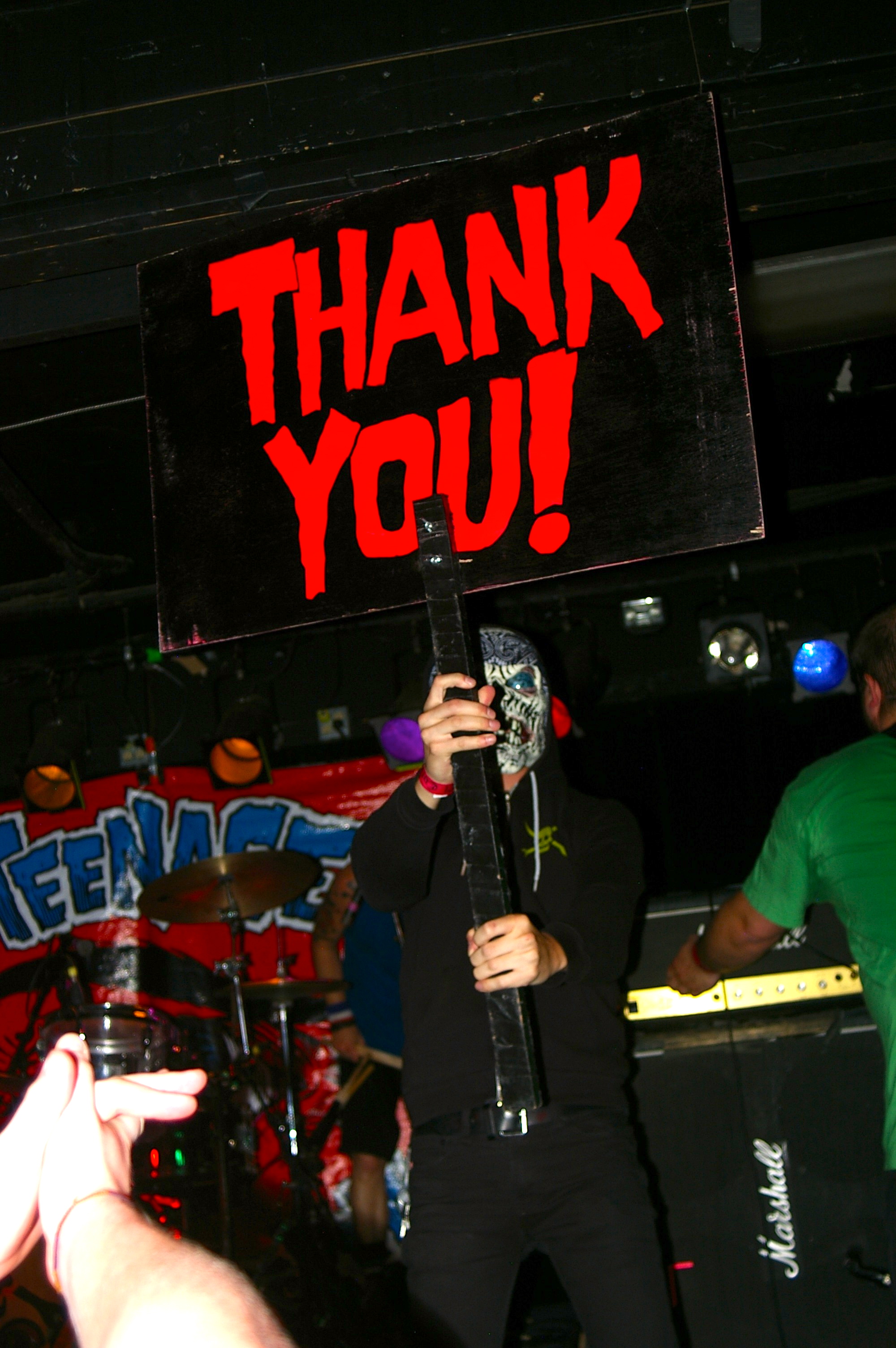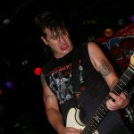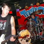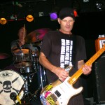 Before the band came out, some dude in a skull mask came on stage waving a red sign with a skull and crossbones on it. This lasted for about one minute (if that) before TBR his the stage with a rocket launch of raw, hard edged punk rock. This is a band that churns out songs that are melodic, yet raw and powerful. They play punk the way punk should sound. I was jostled about in all directions — backward, forward and jerked from side to side so many times I was surprised my internal organs weren’t rearranged. When it was all over, Skull Dude returned to the stage this time holding a red sign stating the words Thank You while the band left the stage. Teenage Bottle Rocket also consist of Kody Templeman – vocals and guitar and Miguel Chen on bass.