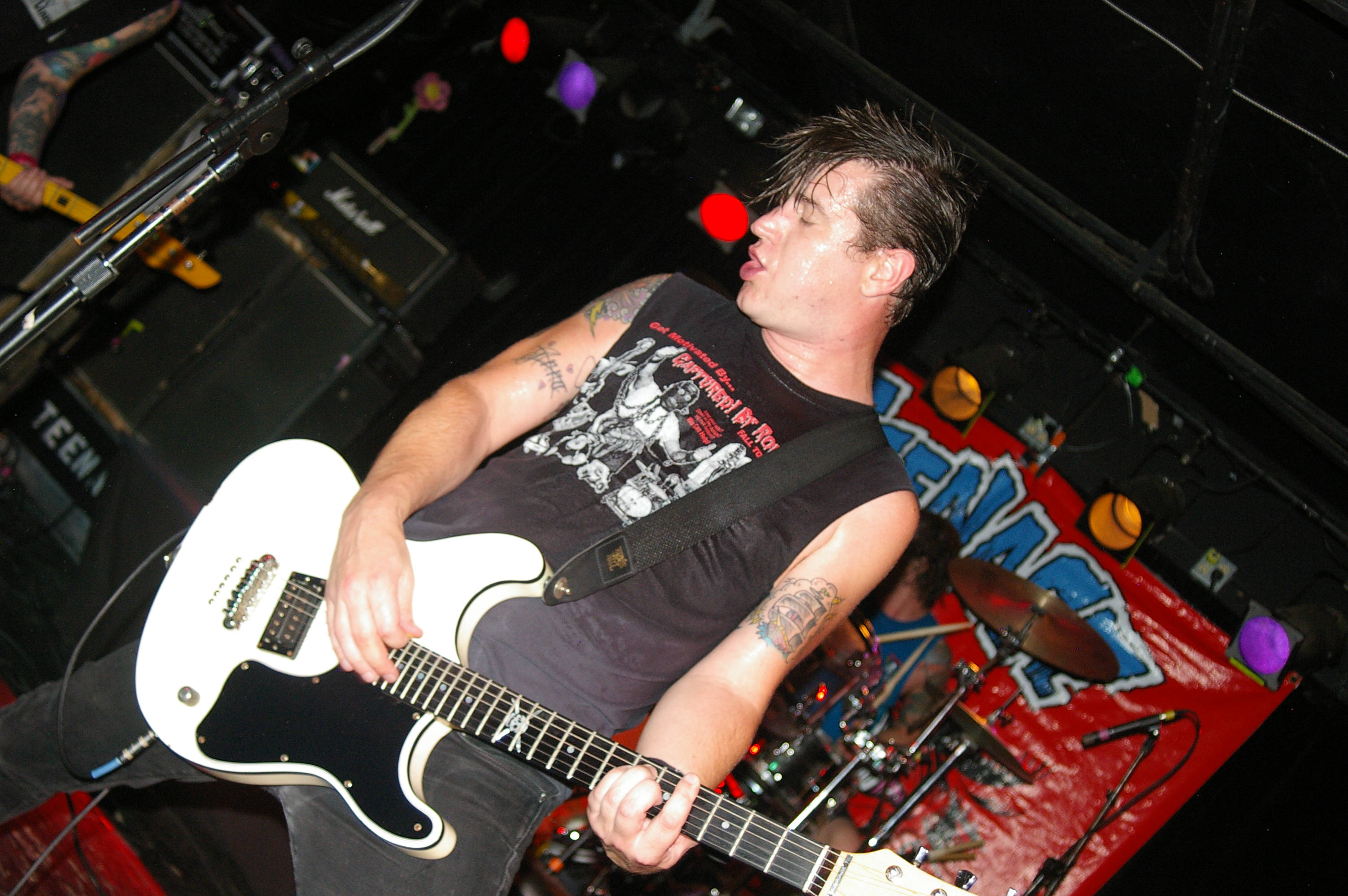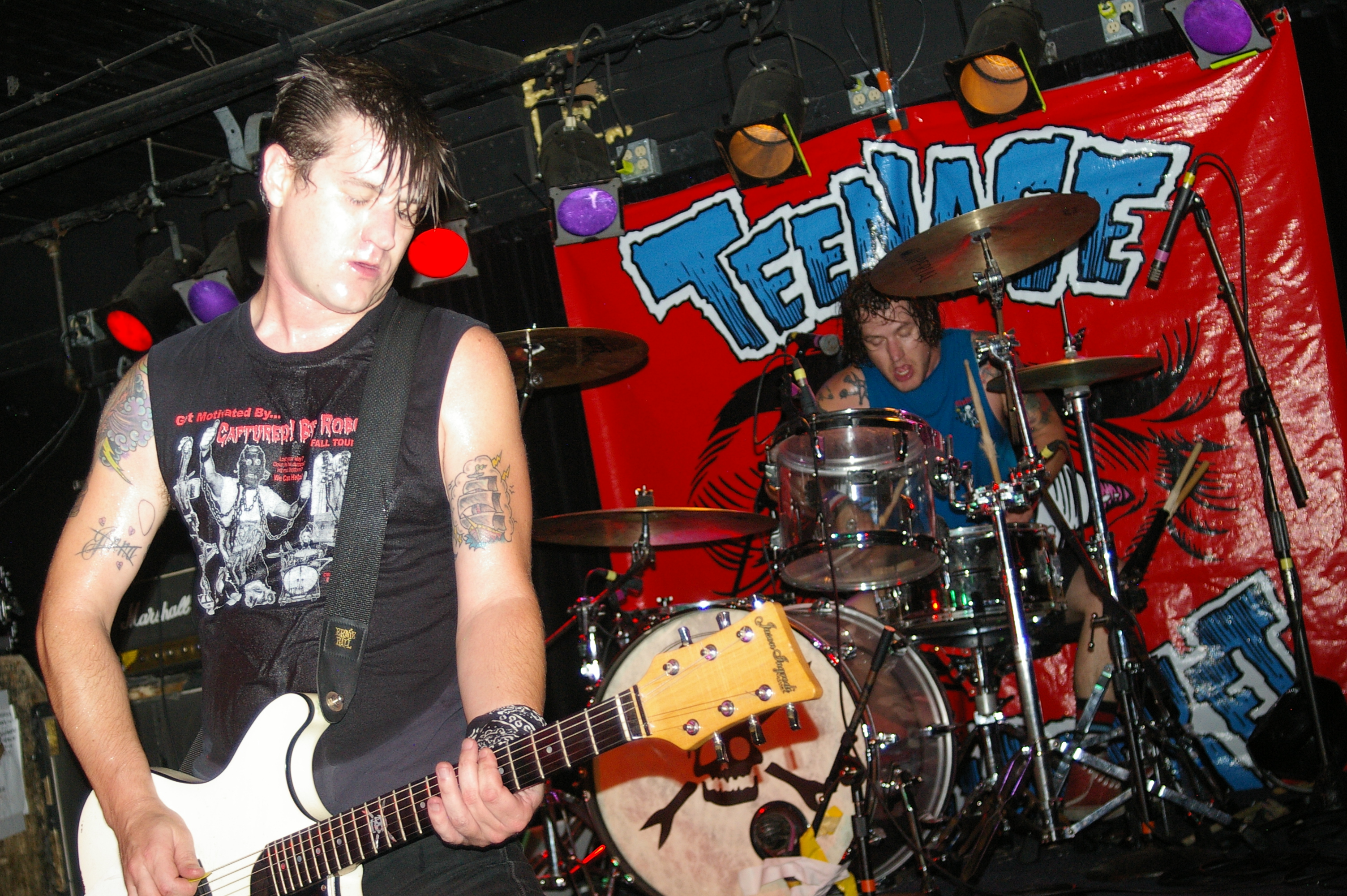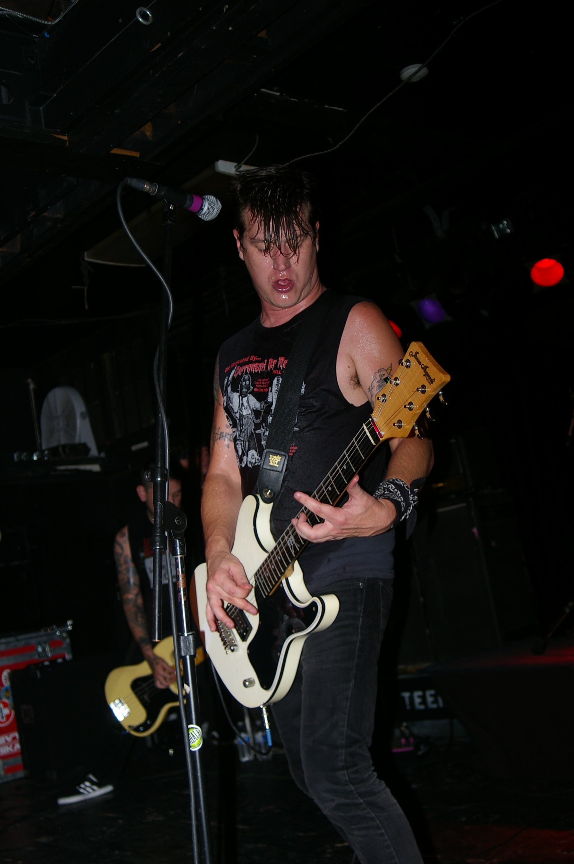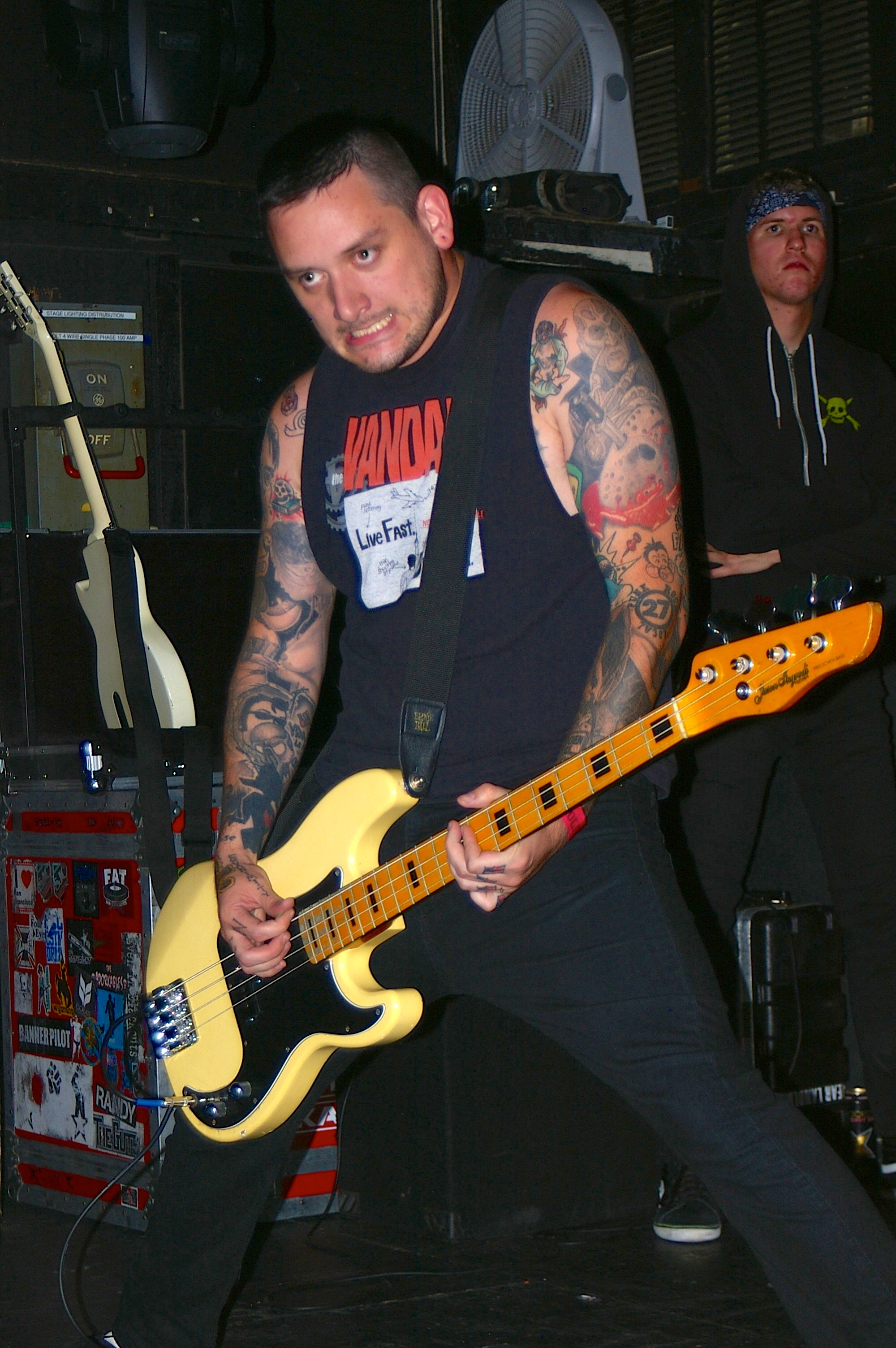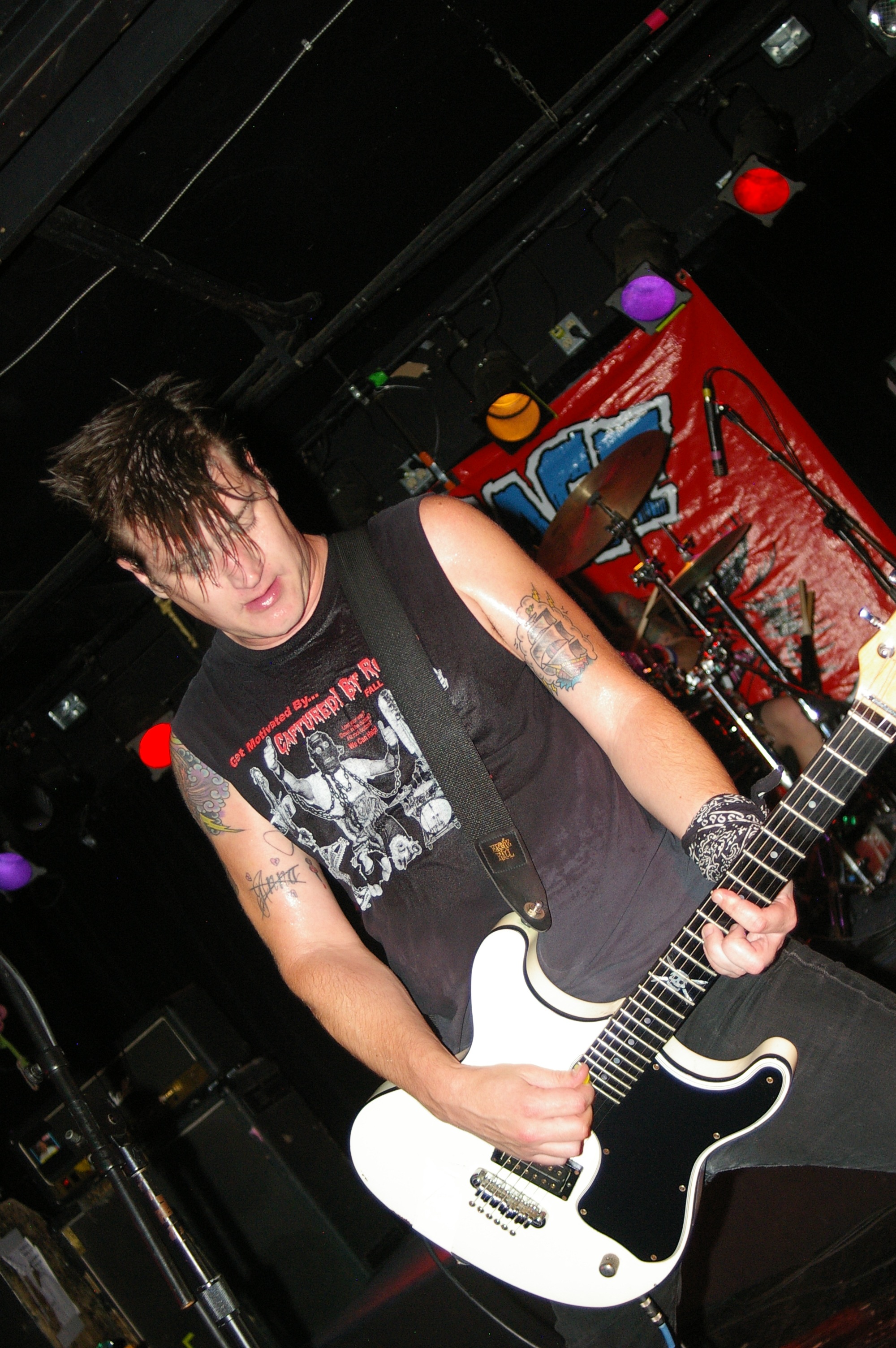 Before the band came out, some dude in a skull mask came on stage waving a red sign with a skull and crossbones on it. This lasted for about one minute (if that) before TBR his the stage with a rocket launch of raw, hard edged punk rock. This is a band that churns out songs that are melodic, yet raw and powerful. They play punk the way punk should sound. I was jostled about in all directions — backward, forward and jerked from side to side so many times I was surprised my internal organs weren’t rearranged. When it was all over, Skull Dude returned to the stage this time holding a red sign stating the words Thank You while the band left the stage. Teenage Bottle Rocket also consist of Kody Templeman – vocals and guitar and Miguel Chen on bass.
