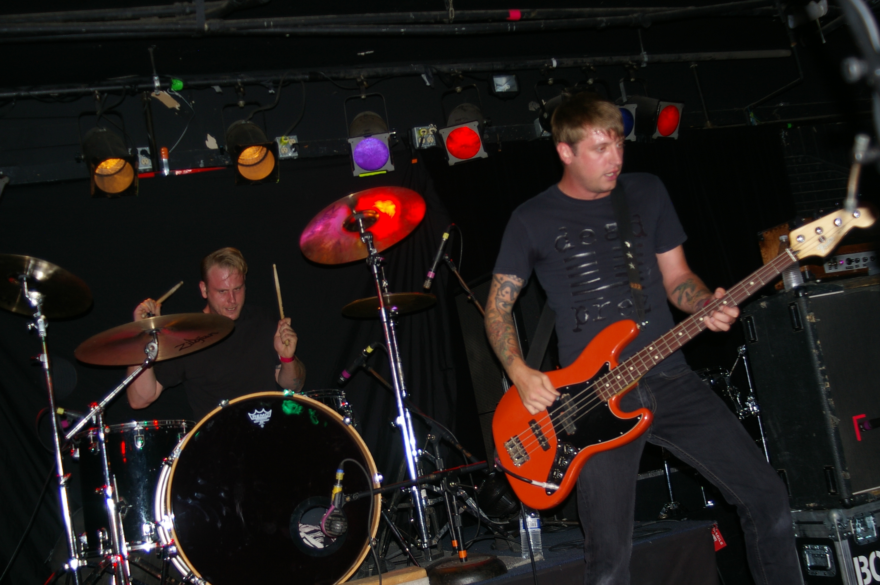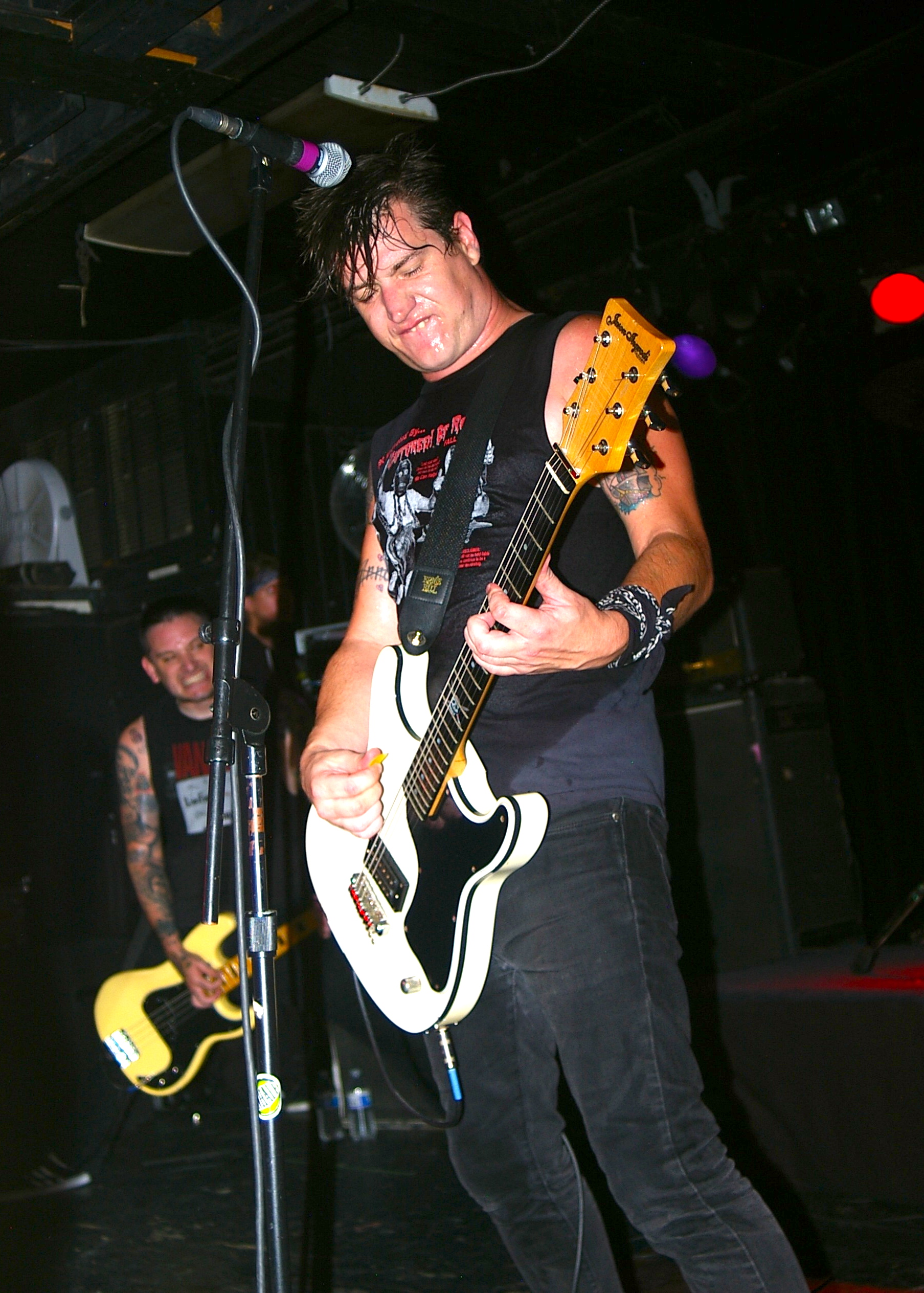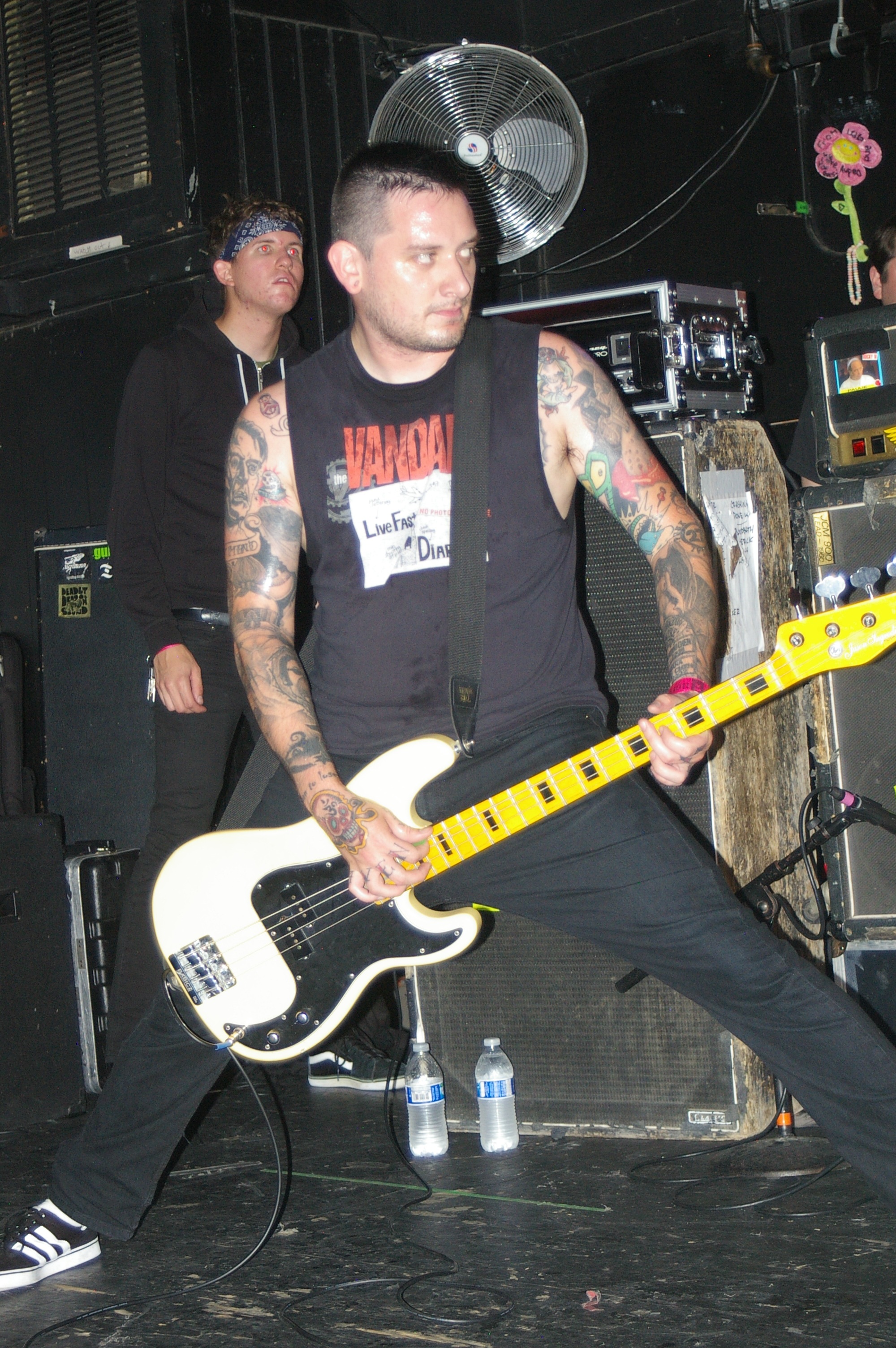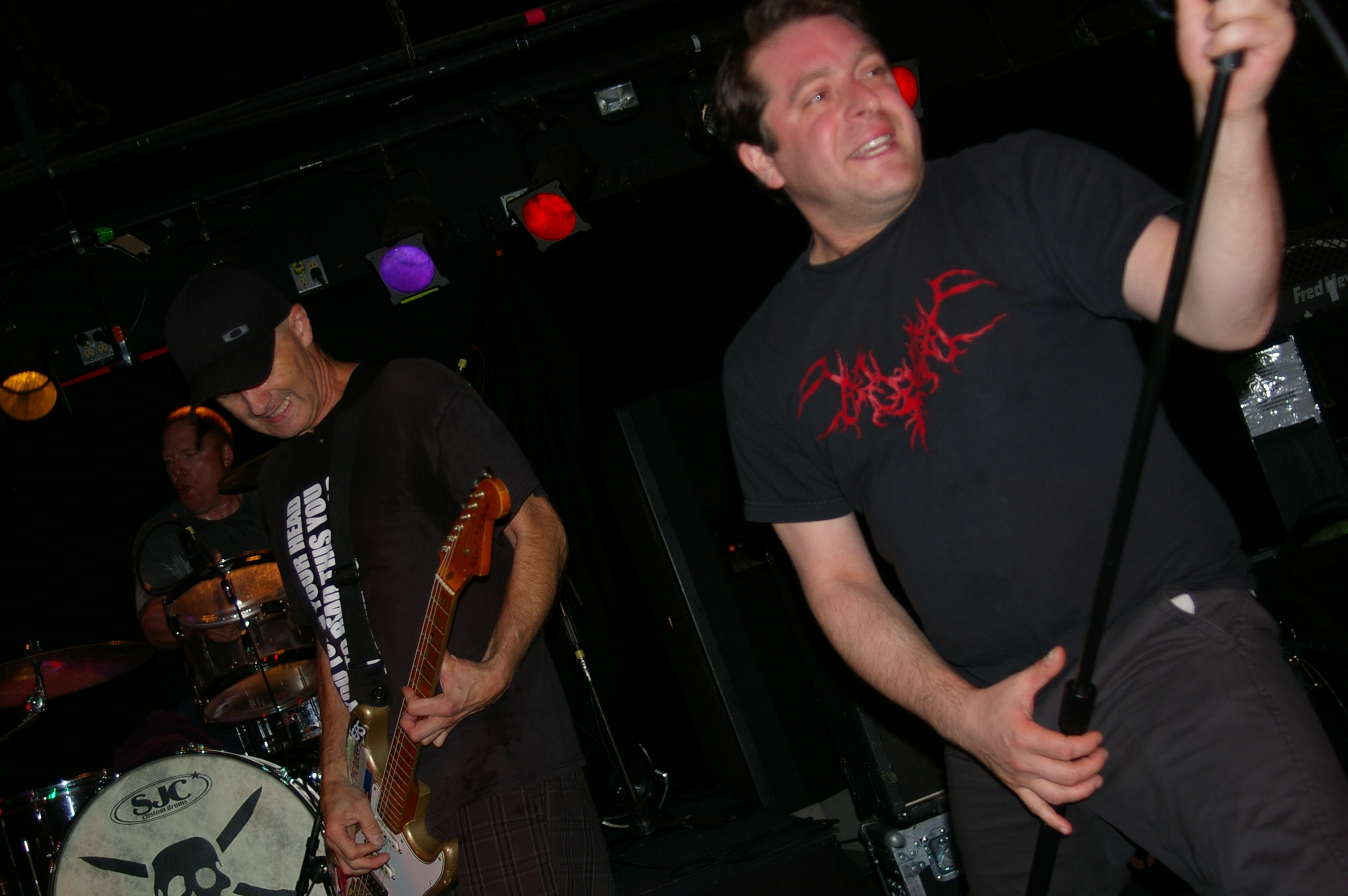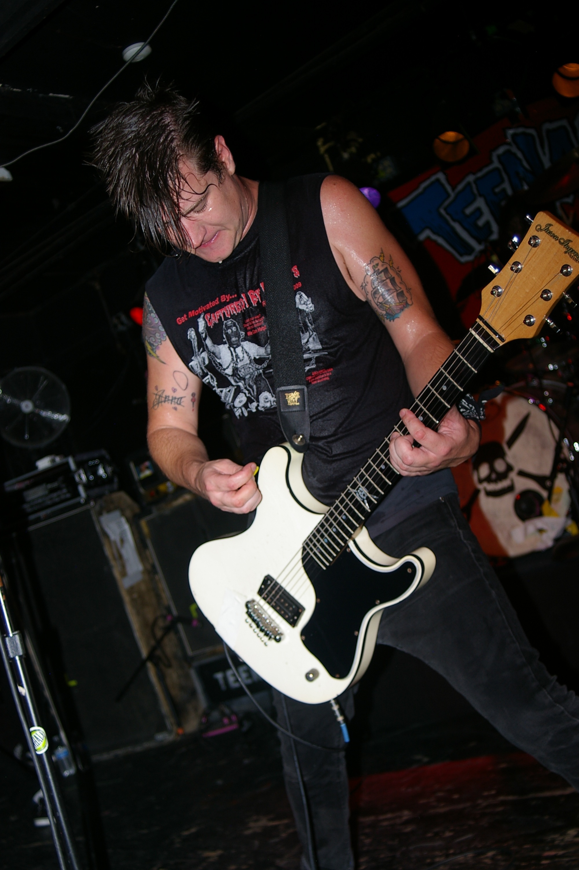 Before the band came out, some dude in a skull mask came on stage waving a red sign with a skull and crossbones on it. This lasted for about one minute (if that) before TBR his the stage with a rocket launch of raw, hard edged punk rock. This is a band that churns out songs that are melodic, yet raw and powerful. They play punk the way punk should sound. I was jostled about in all directions — backward, forward and jerked from side to side so many times I was surprised my internal organs weren’t rearranged. When it was all over, Skull Dude returned to the stage this time holding a red sign stating the words Thank You while the band left the stage. Teenage Bottle Rocket also consist of Kody Templeman – vocals and guitar and Miguel Chen on bass.