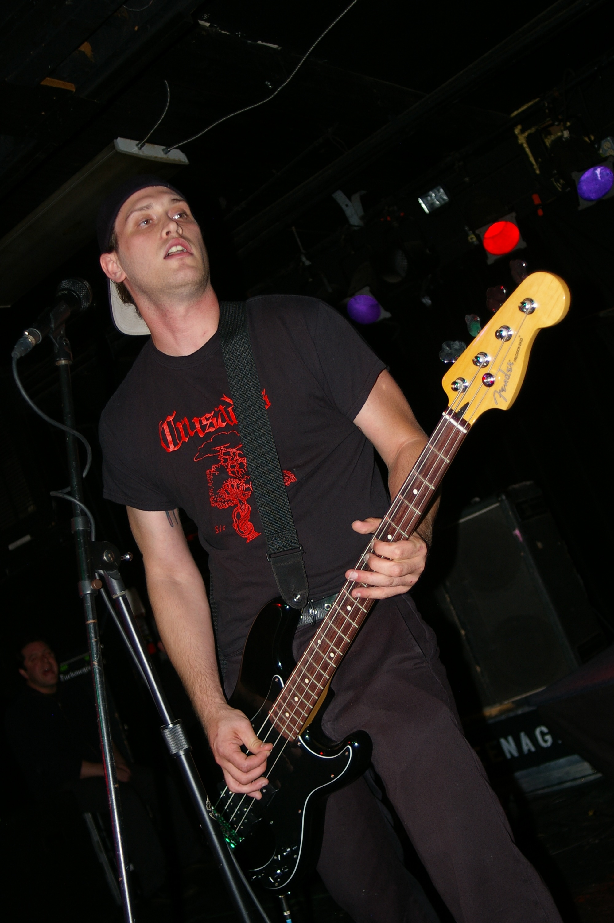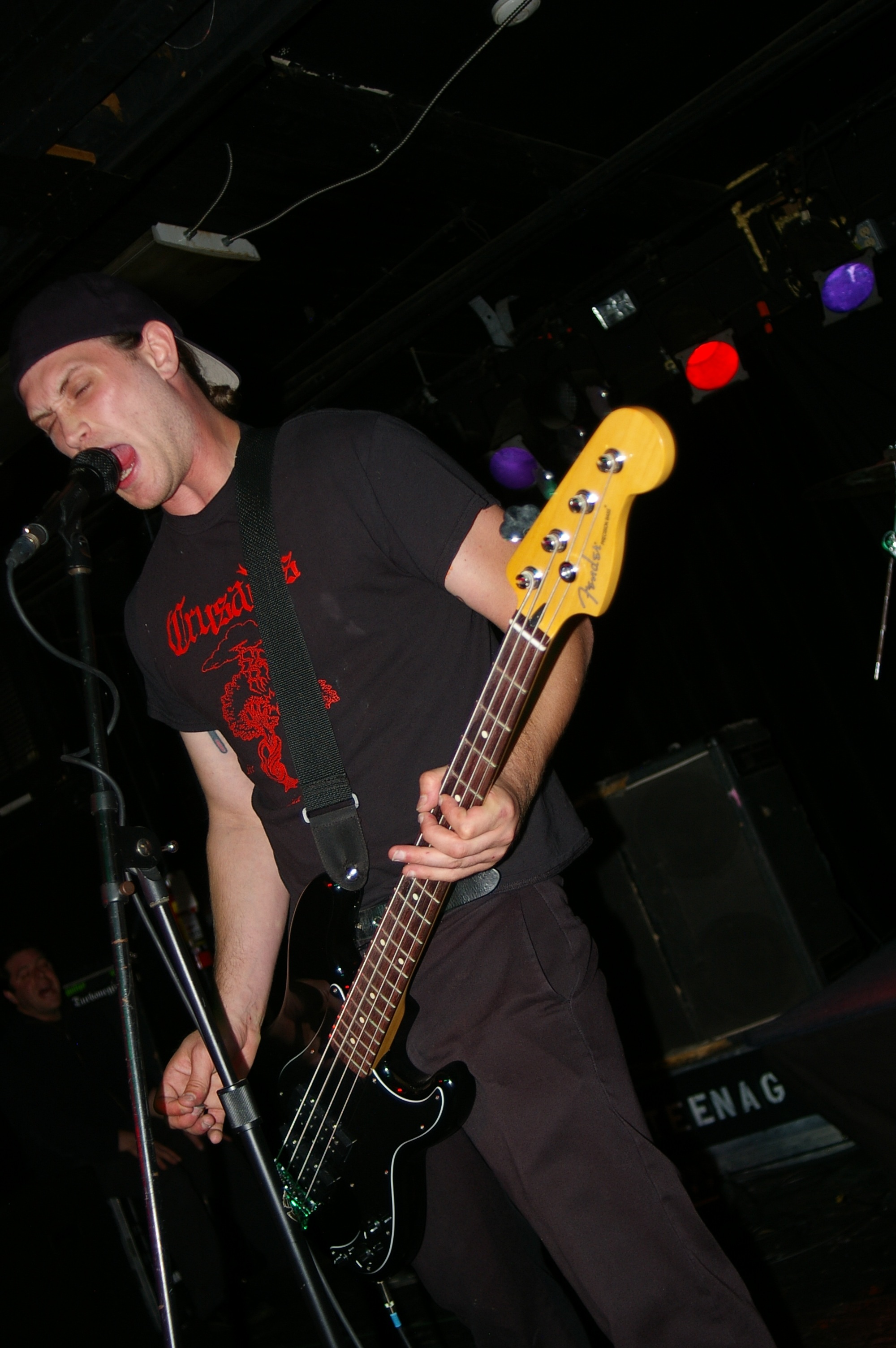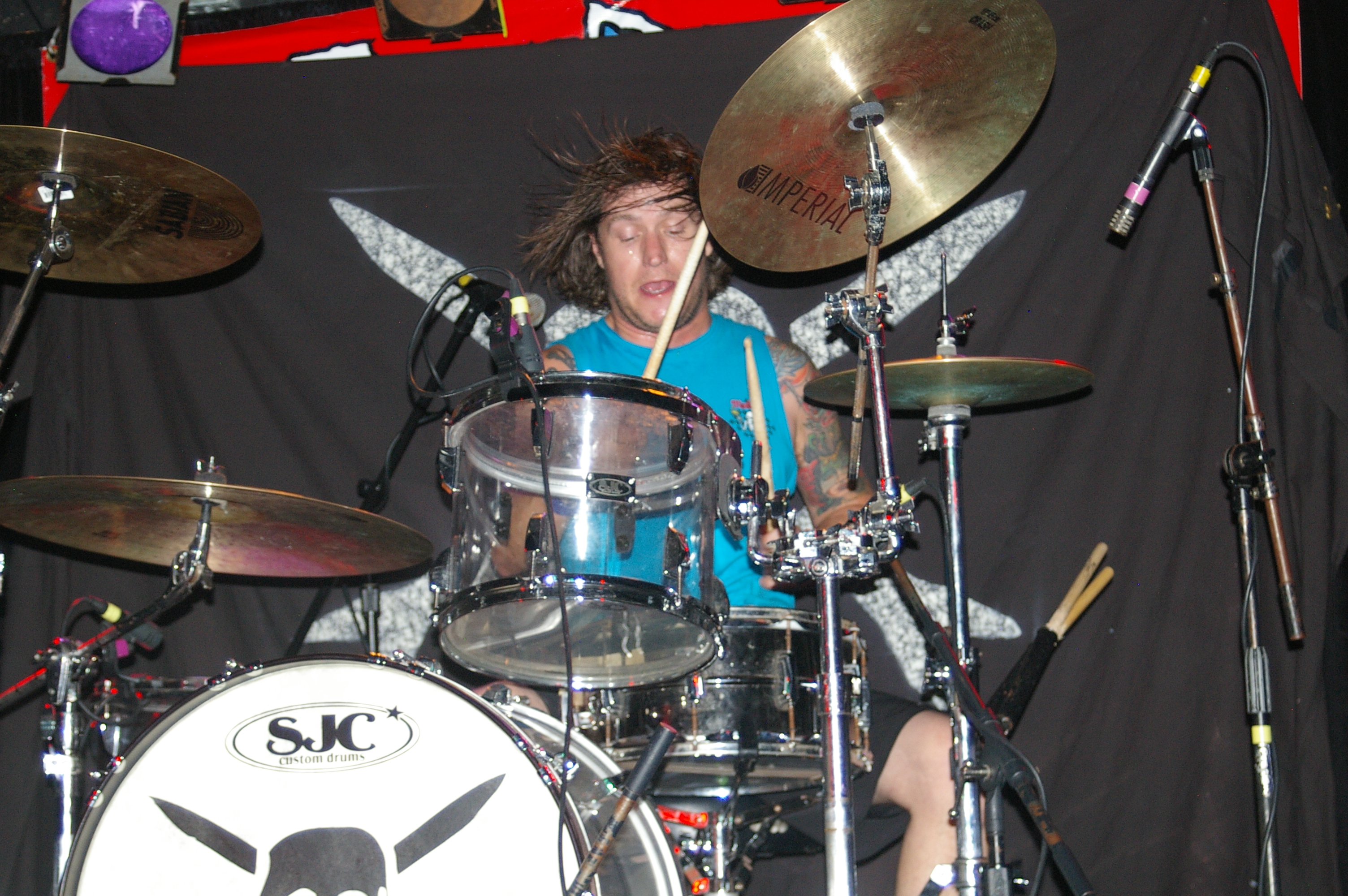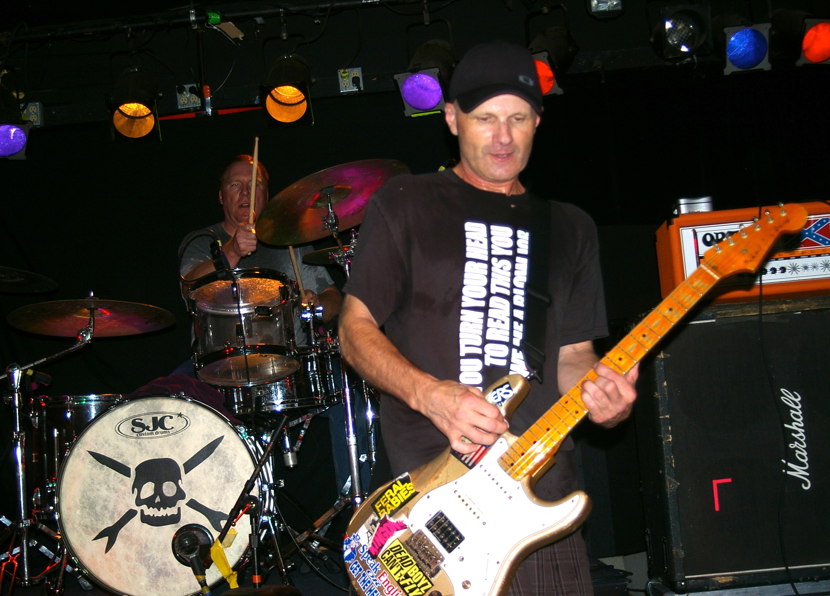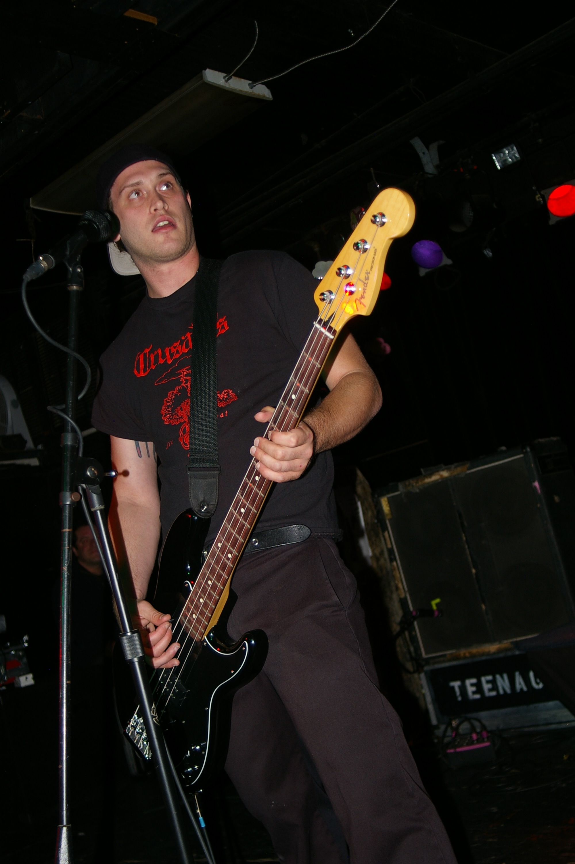 Before the band came out, some dude in a skull mask came on stage waving a red sign with a skull and crossbones on it. This lasted for about one minute (if that) before TBR his the stage with a rocket launch of raw, hard edged punk rock. This is a band that churns out songs that are melodic, yet raw and powerful. They play punk the way punk should sound. I was jostled about in all directions — backward, forward and jerked from side to side so many times I was surprised my internal organs weren’t rearranged. When it was all over, Skull Dude returned to the stage this time holding a red sign stating the words Thank You while the band left the stage. Teenage Bottle Rocket also consist of Kody Templeman – vocals and guitar and Miguel Chen on bass.