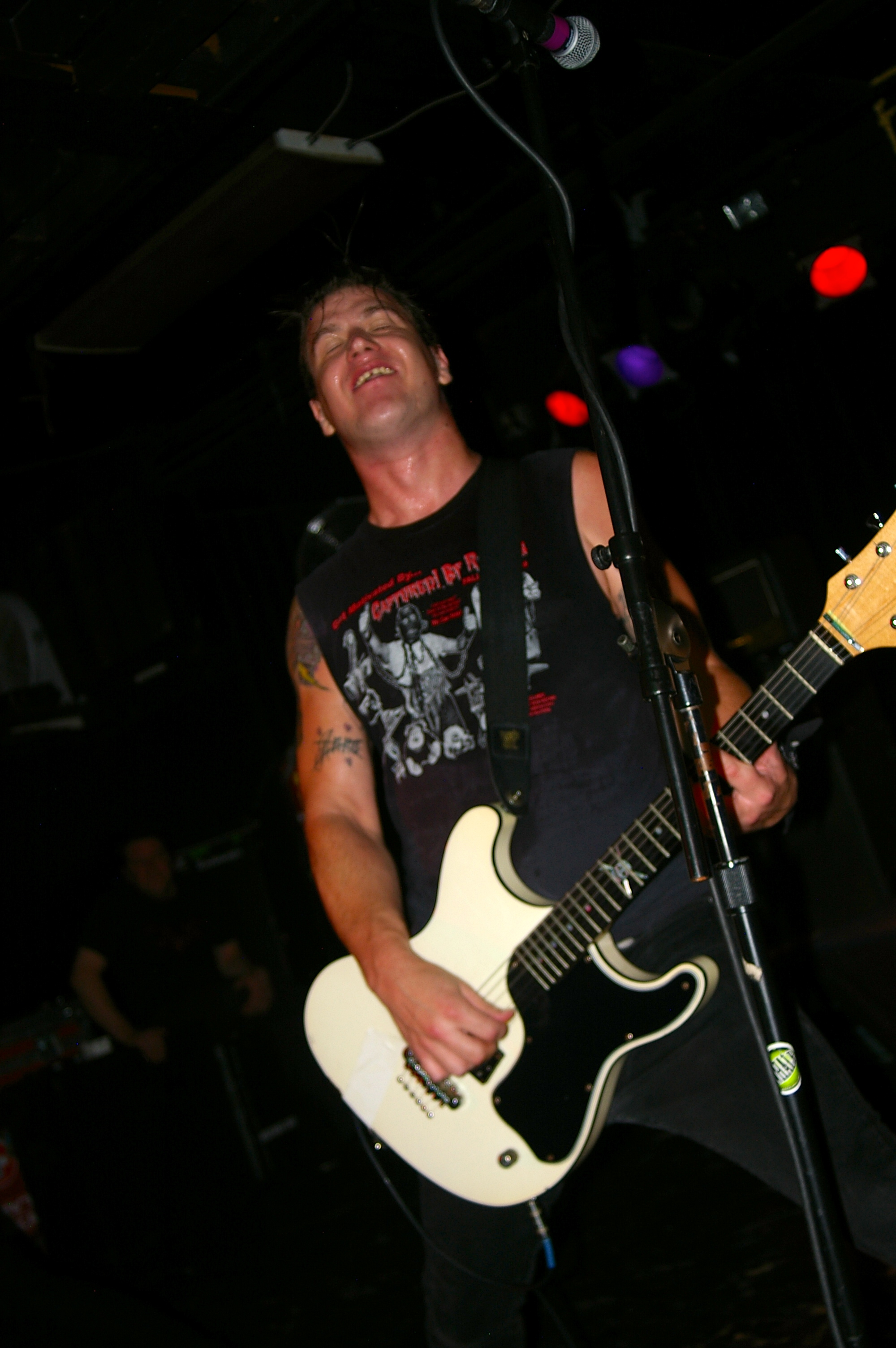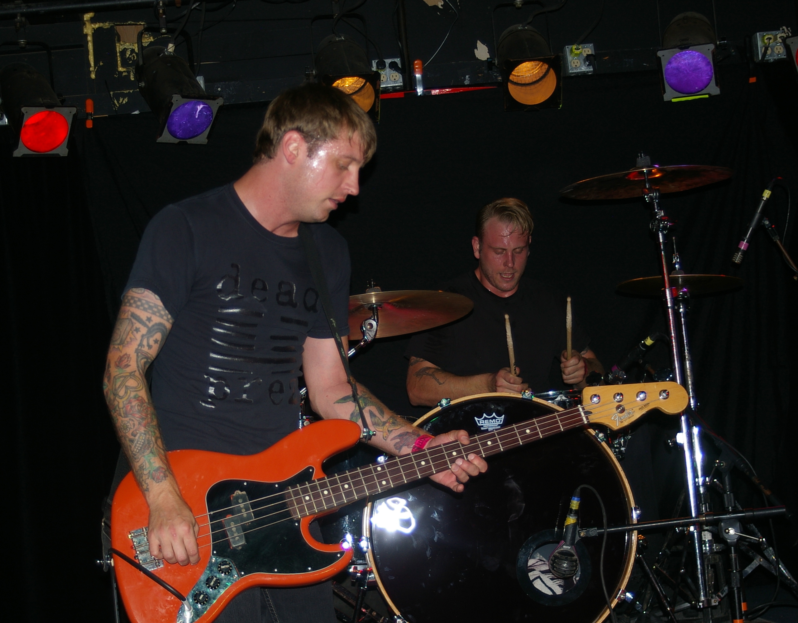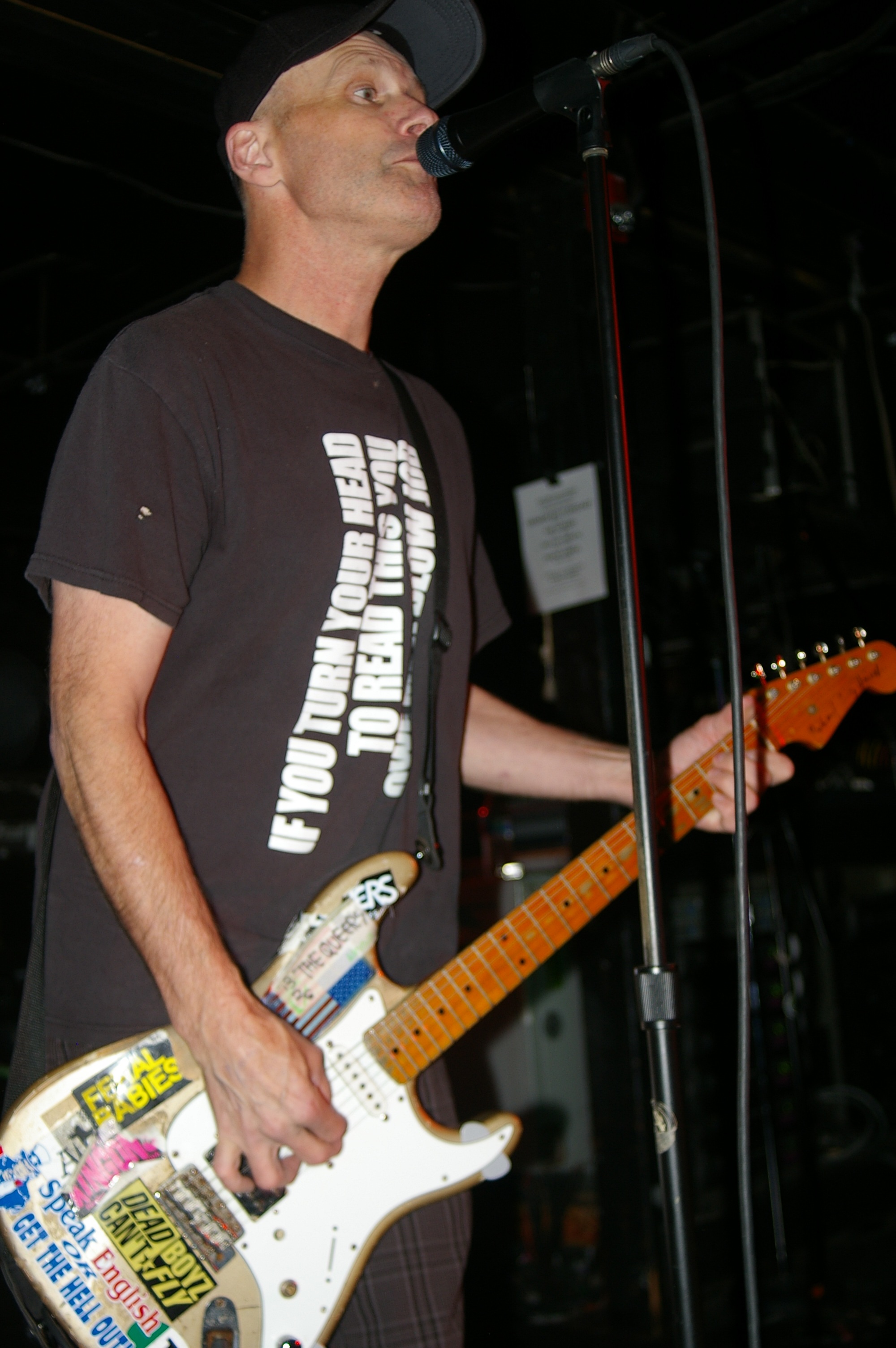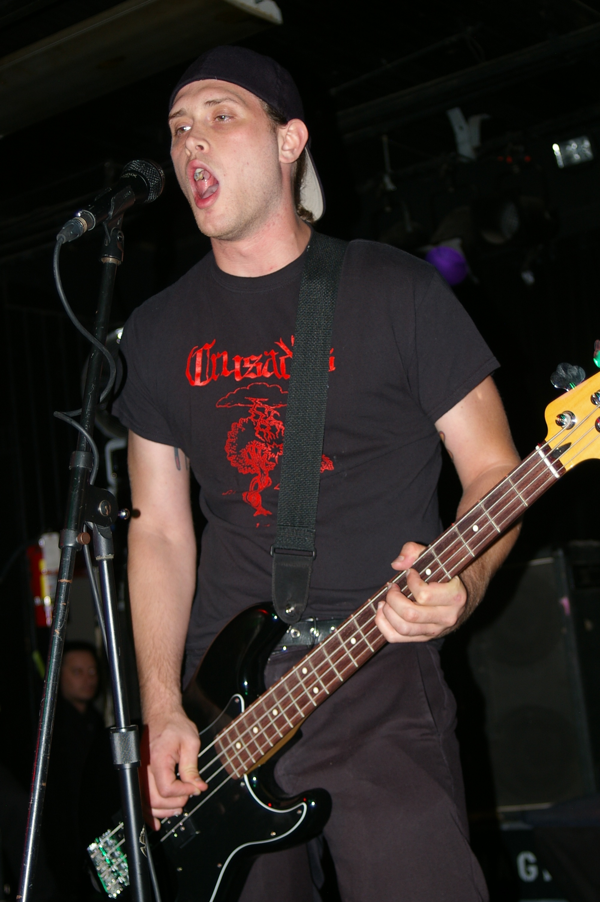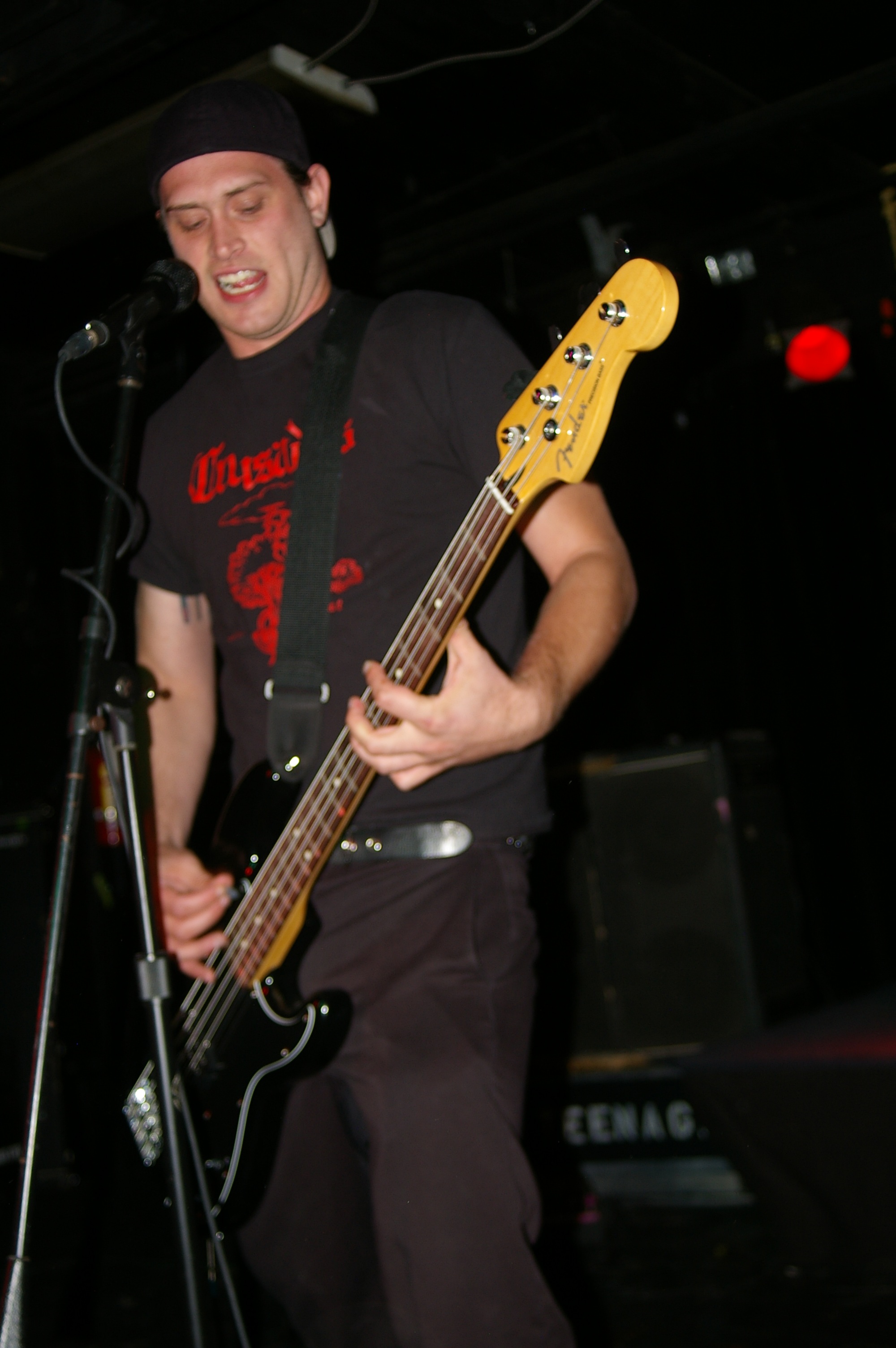 Before the band came out, some dude in a skull mask came on stage waving a red sign with a skull and crossbones on it. This lasted for about one minute (if that) before TBR his the stage with a rocket launch of raw, hard edged punk rock. This is a band that churns out songs that are melodic, yet raw and powerful. They play punk the way punk should sound. I was jostled about in all directions — backward, forward and jerked from side to side so many times I was surprised my internal organs weren’t rearranged. When it was all over, Skull Dude returned to the stage this time holding a red sign stating the words Thank You while the band left the stage. Teenage Bottle Rocket also consist of Kody Templeman – vocals and guitar and Miguel Chen on bass.