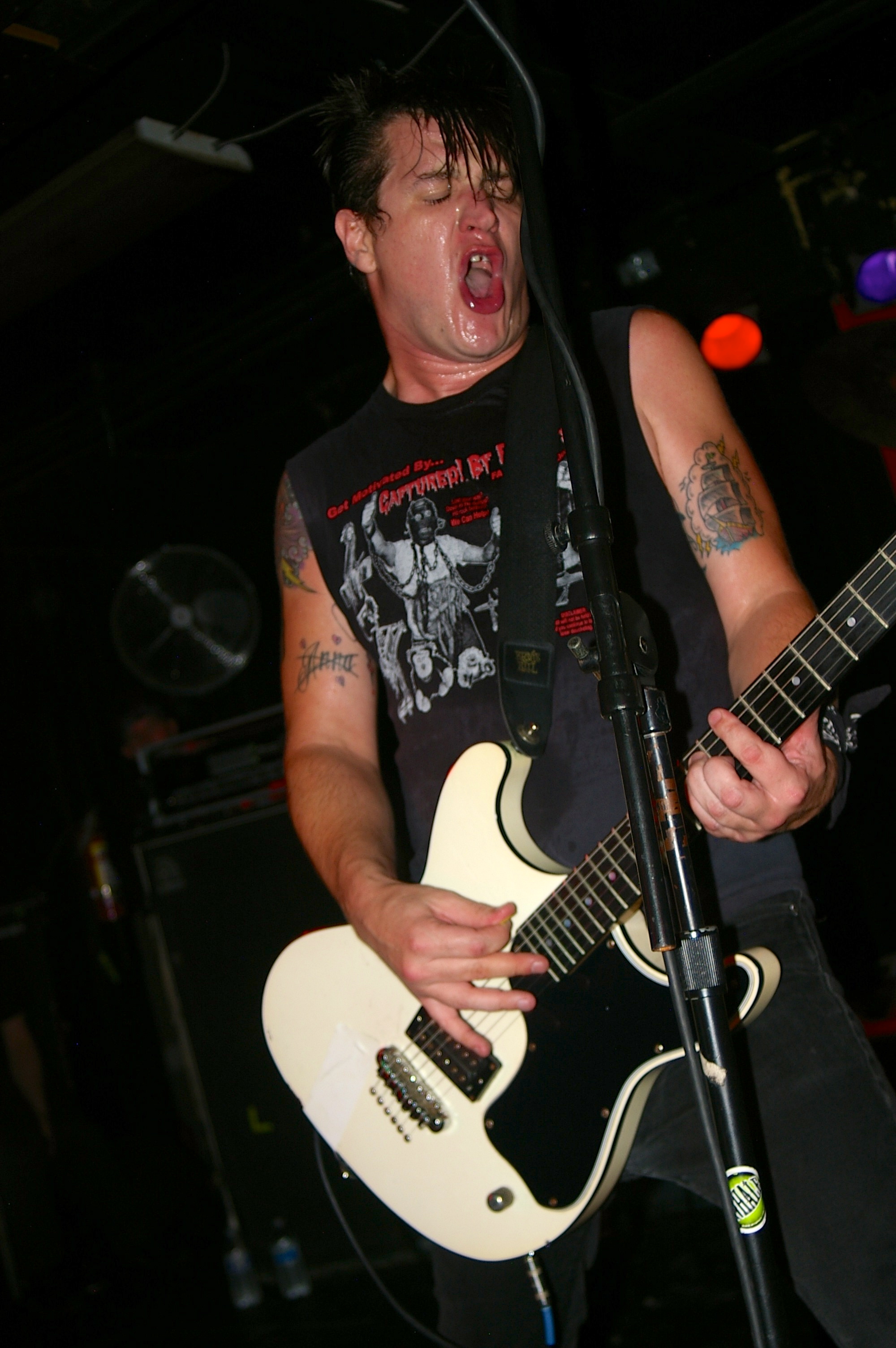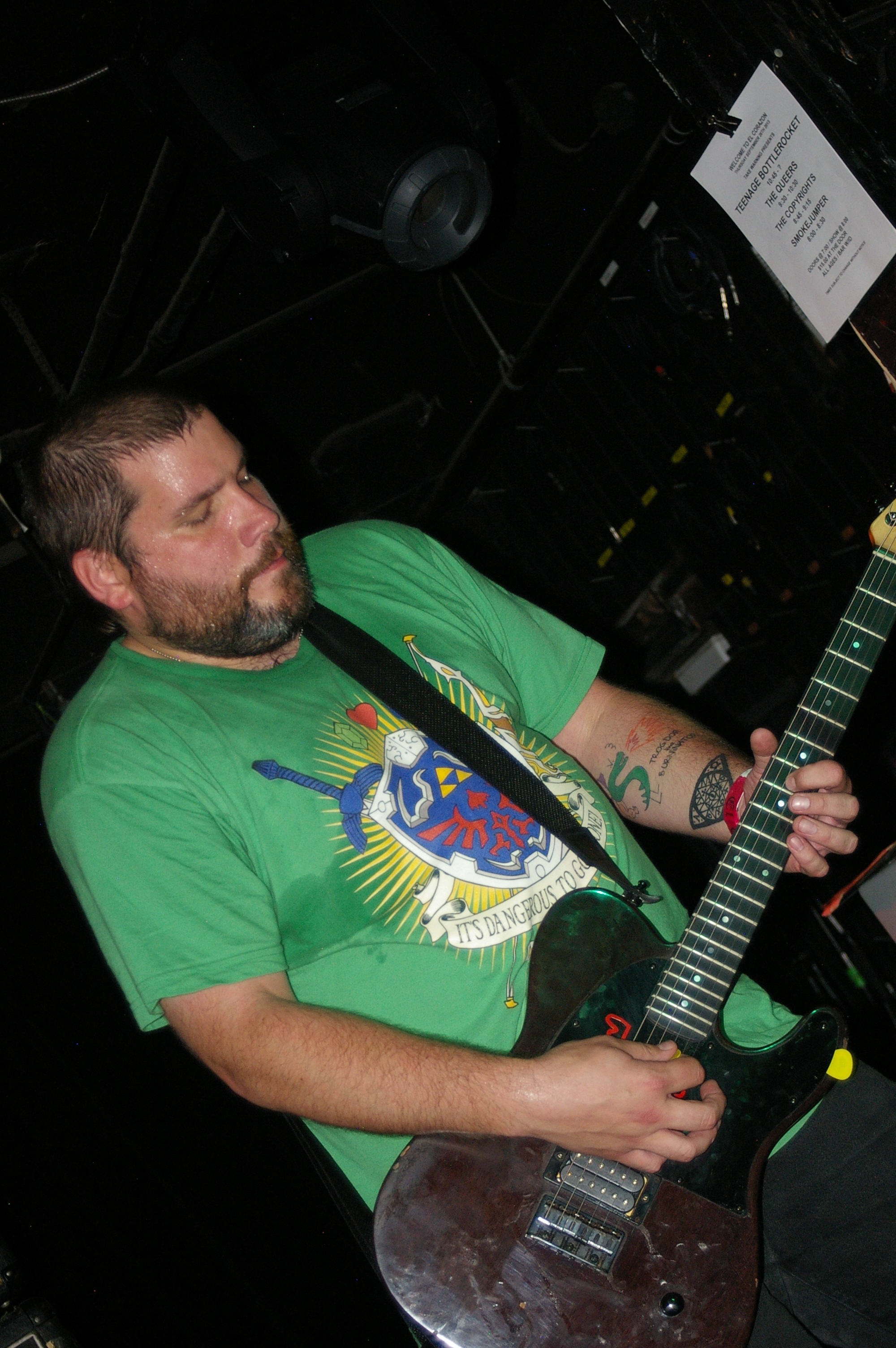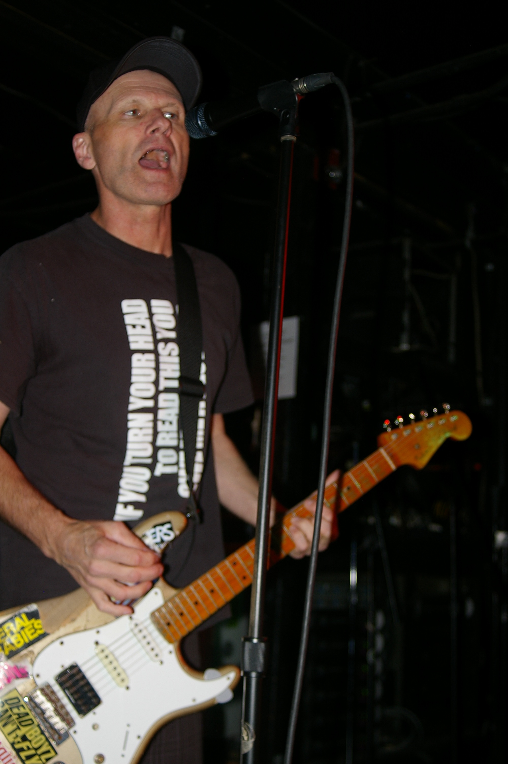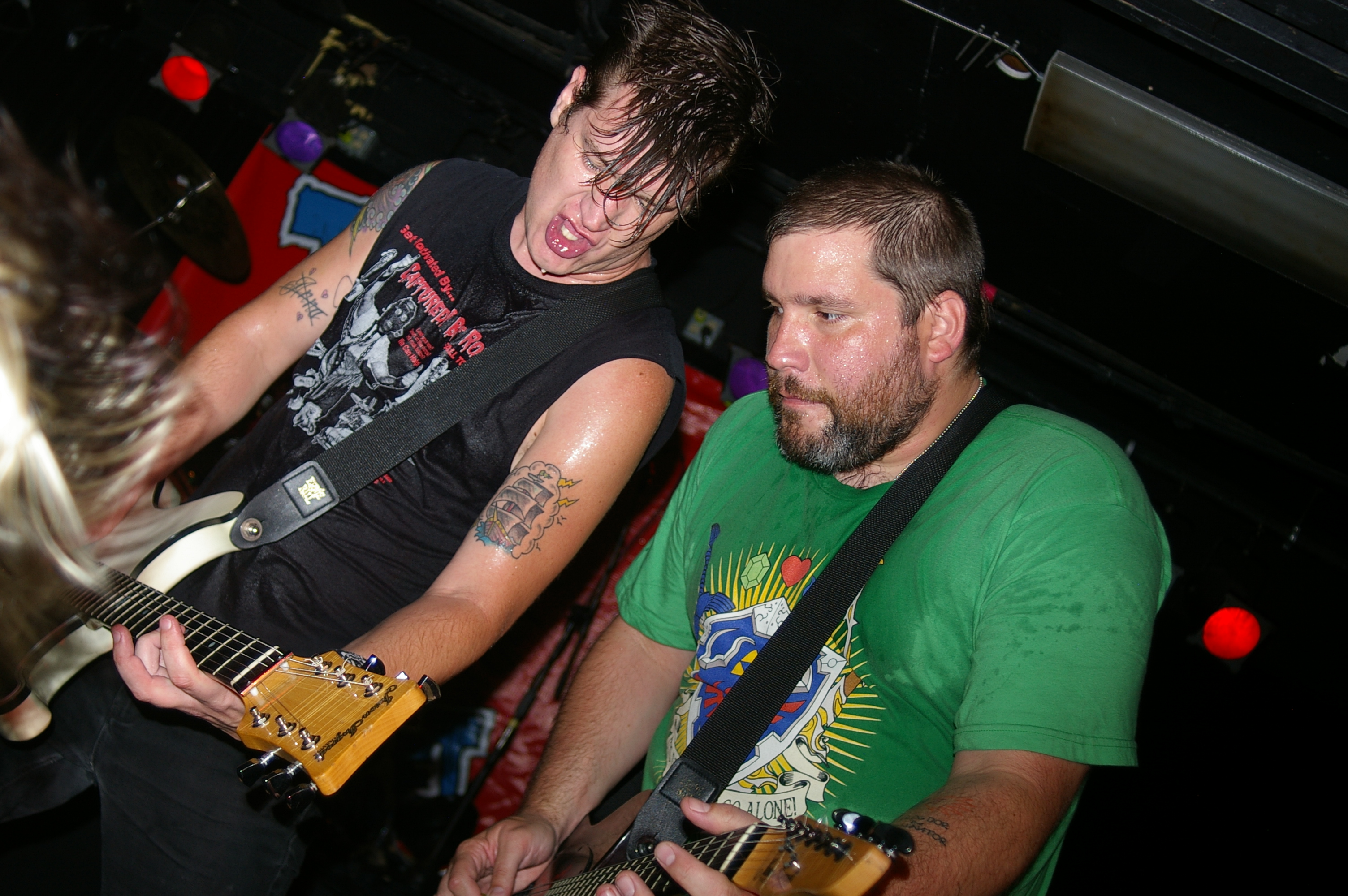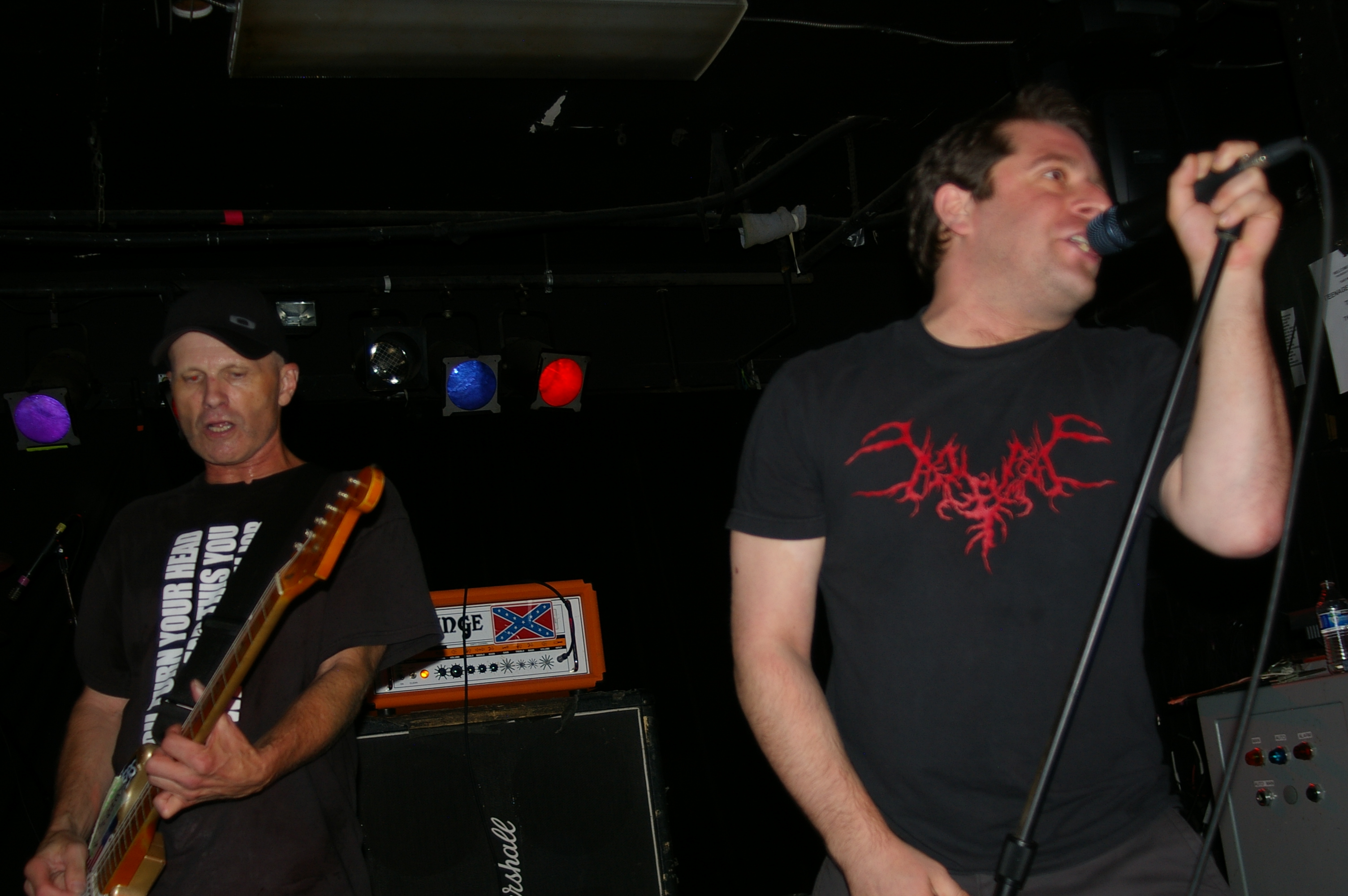 Before the band came out, some dude in a skull mask came on stage waving a red sign with a skull and crossbones on it. This lasted for about one minute (if that) before TBR his the stage with a rocket launch of raw, hard edged punk rock. This is a band that churns out songs that are melodic, yet raw and powerful. They play punk the way punk should sound. I was jostled about in all directions — backward, forward and jerked from side to side so many times I was surprised my internal organs weren’t rearranged. When it was all over, Skull Dude returned to the stage this time holding a red sign stating the words Thank You while the band left the stage. Teenage Bottle Rocket also consist of Kody Templeman – vocals and guitar and Miguel Chen on bass.