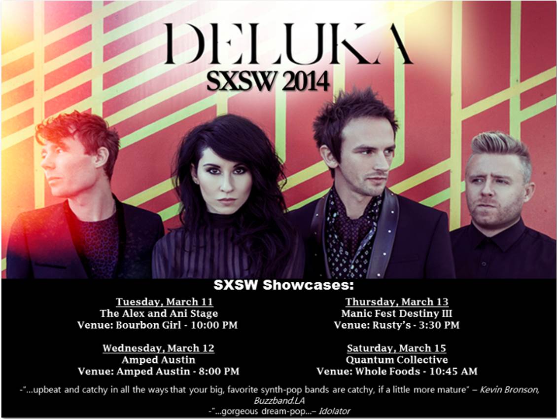 I like this new tune from Deluka, particularly the easy, 80s theatricality in the vocals of Ellie Innocenti. She is, of course, lovely to look at as well. Her voice sounds like a Stoli Gimlet, full of limey bite, worldly burn and mysterious physiological comfort. Deluka will appear several times at SXSW. The photo below should direct you.