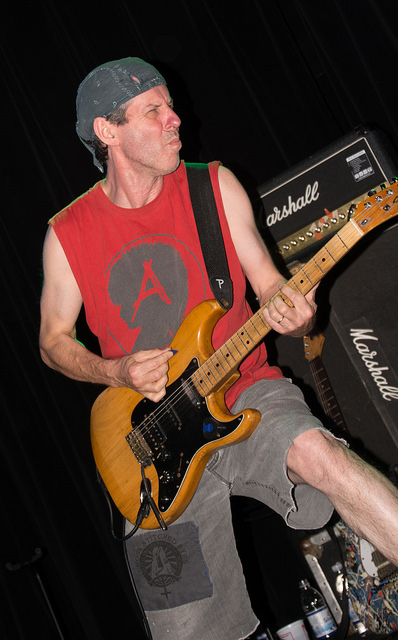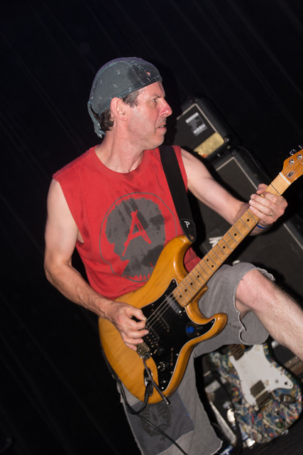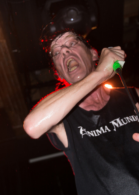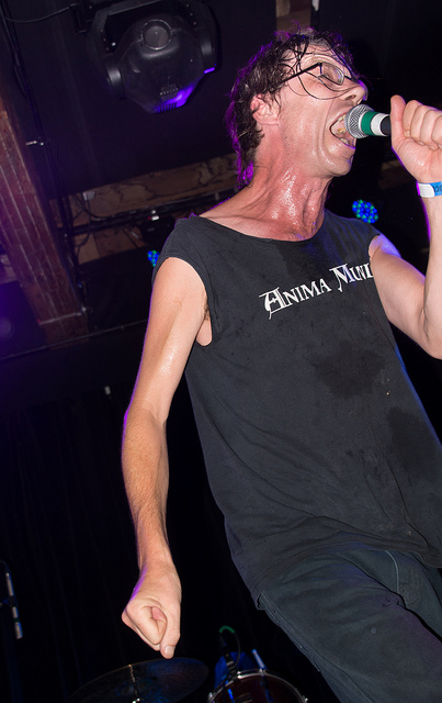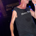 Subhumans didn’t come on stage as much as they ignited it. Front man Dick Lucas flitted about the stage like a lit firecracker, standing in one place no longer than a second or two. He didn’t sing as much as he shouted out lyrics with a left wing leaning. Within minutes sweat dripped from him and soaked through his clothes. Many in the audience knew most the songs and shouted along. I was shoved and jostled in every direction almost non stop and felt fortunate the stage divers did their acrobats to either side of me so no dodging was required on my part on that front.