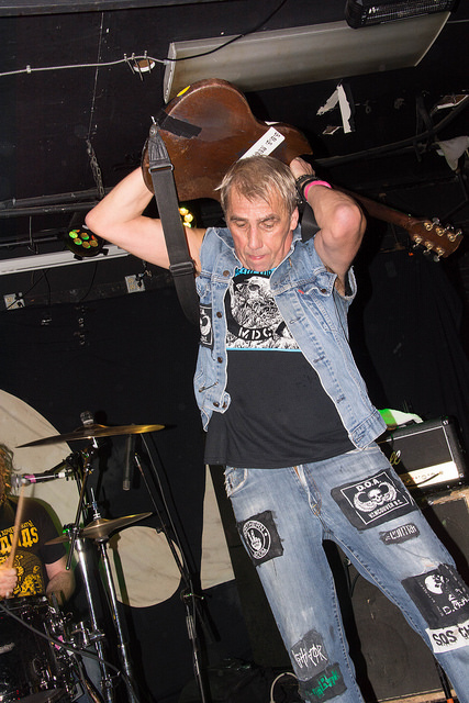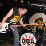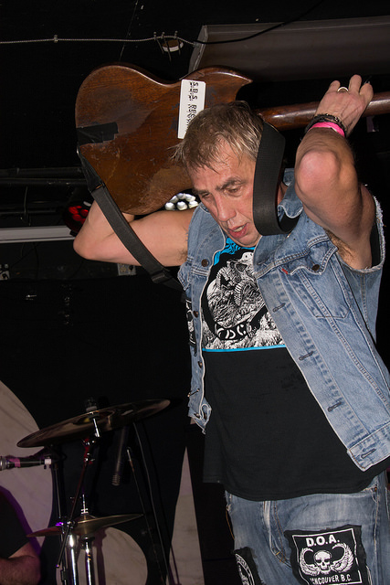 The second D.O.A hit the stage I was continually shoved so hard against the stage I thought I’d be chopped in half. Bassist Mike Hodsall strutted about the stage constantly, which included frequent kicks and leaps. Singer/guitarist Joey Keithley (AKA Joey Shithead) played his guitar by holding it over his head, or behind his back and even played it with his mouth. He often performed windmills a la Pete Townshend.
