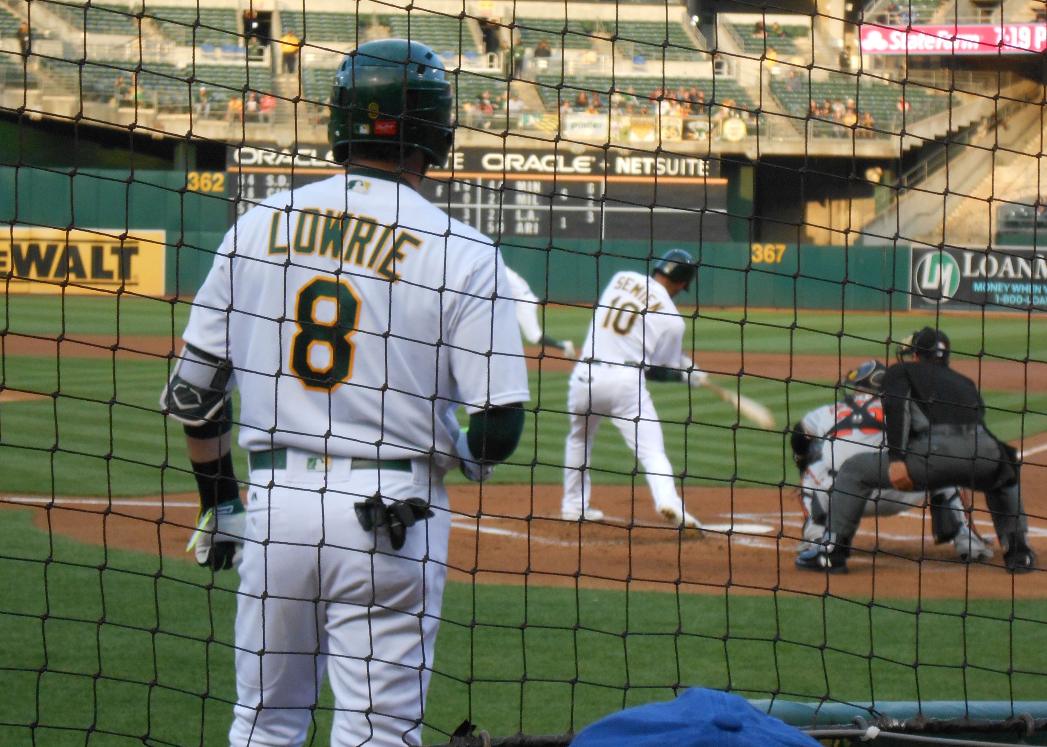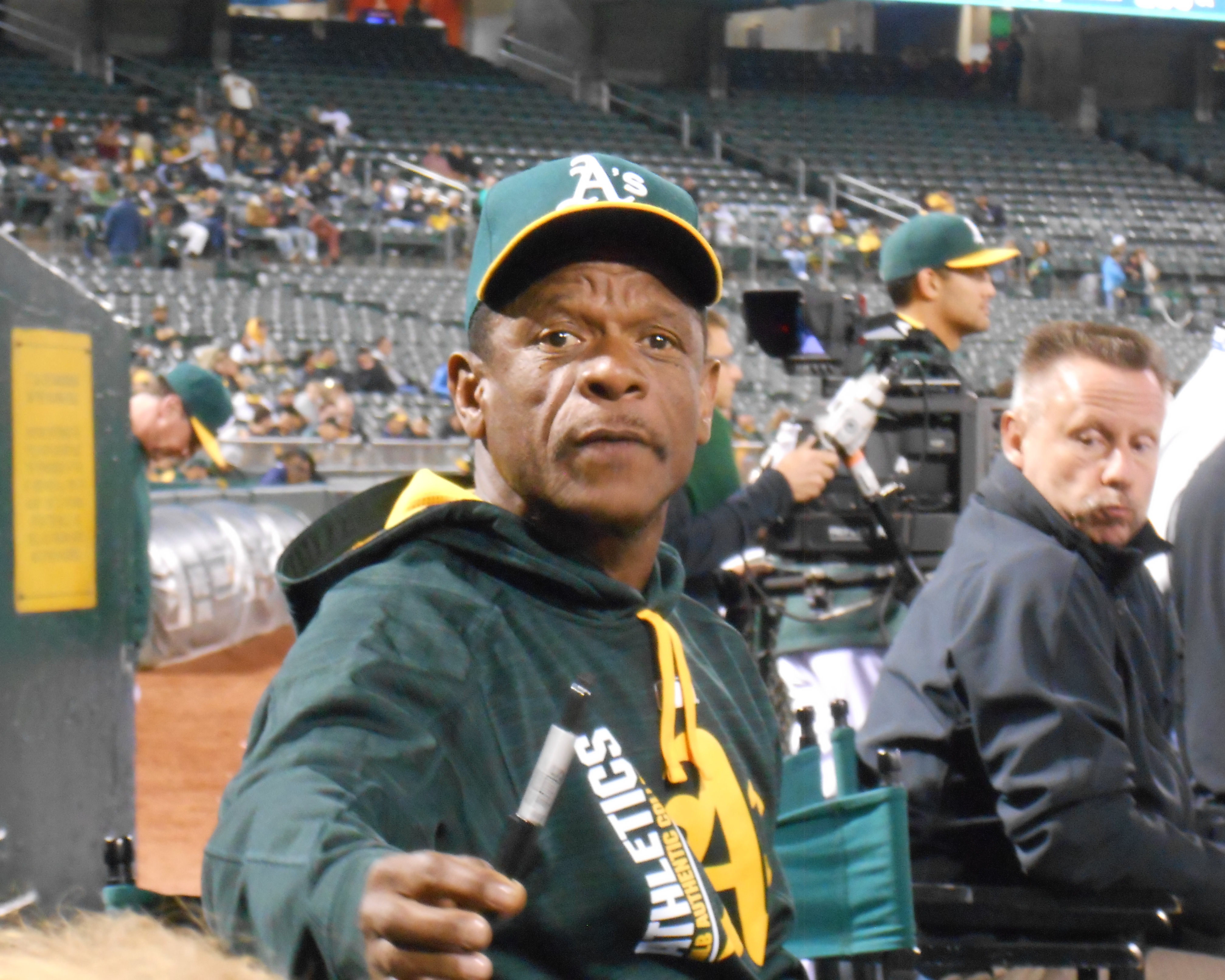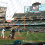 Last Thursday evening, courtesy of a generous friend in the right place, I had the privilege of seeing the Oakland A’s three rows up from home plate. I’ve had some good seats in the past, but nothing nearly as up close and personal with major league ball players as this. The seats, in what is called the Diamond Level, are accessed through the same tunnels as used by the teams, and it is not unusual to bump into uniformed players on your way to the rest room. Another perk, which I foolishly failed to prepare for, is the presence of former A’s stars, in this case Hall-of-Famer Rickey Henderson, who might sit nearby and generously sign autographs. If I get another opportunity like this, I will definitely take a baseball with me.