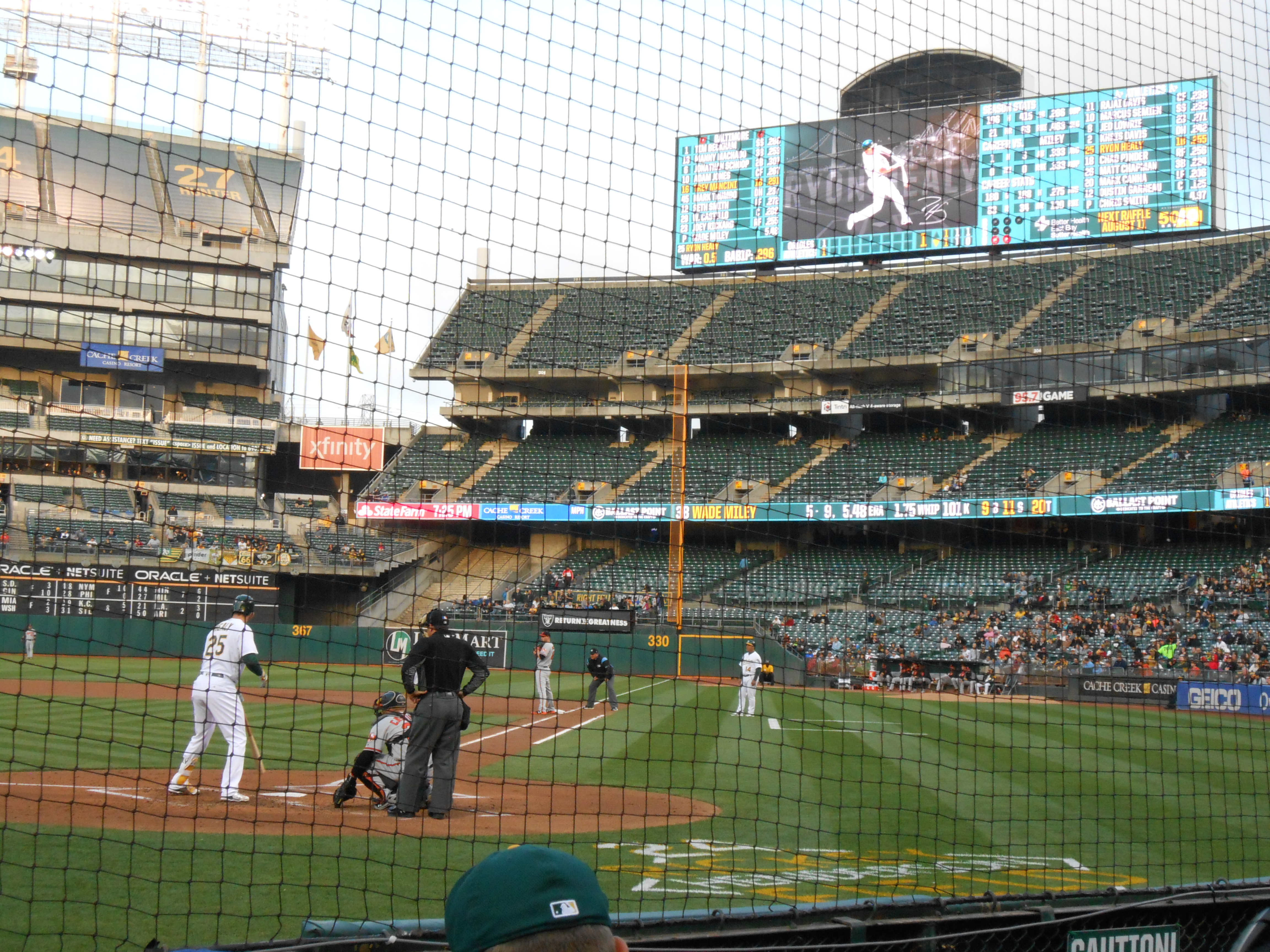 The game, unfortunately, did not go well for the A’s fans in attendance that night. The main highlights were the home runs on consecutive pitches given up by A’s pitcher Chris Smith not once but twice during the game—that’s four dingers. Other than that, two observations came to mind. First, the Oakland Coliseum has an ungodly amount of foul territory – about as wide on each side as the full infield. If I were pitching there, I would do everything I could to develop my ability to induce pop-ups. A lot of outs could be had on balls that in any other park would drift into the stands.