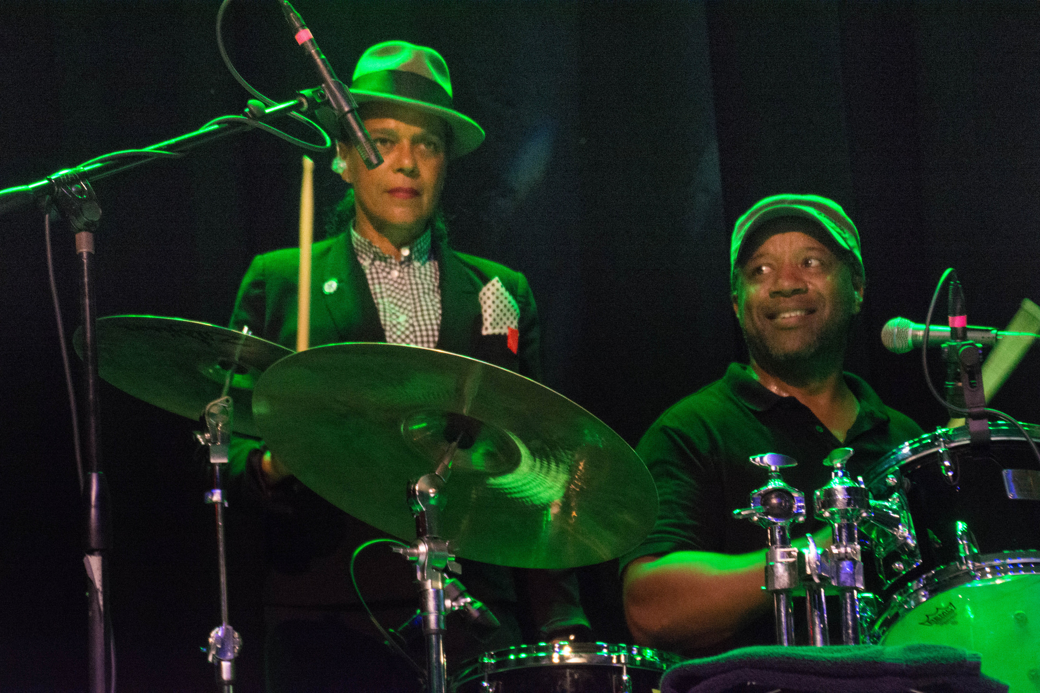 None of the members of the Selecter stood in one spot very long. Arthur strutted about the stage, kicked up his heels, and spun about practically non-stop as if he had joints everywhere on his body. He could move! Pauline, on the other hand, dripped with charm while Arthur dripped with sweat. Pauline often moved to the very edge of the stage to lean into the crowd. During one song she joined Winston on the drums, standing beside him and tapping a cymbal. When they performed their more famous songs, On My Radio and Too Much Pressure (which they infused a bit of Pressure Drop into) there wasn’t a still body in the theater.