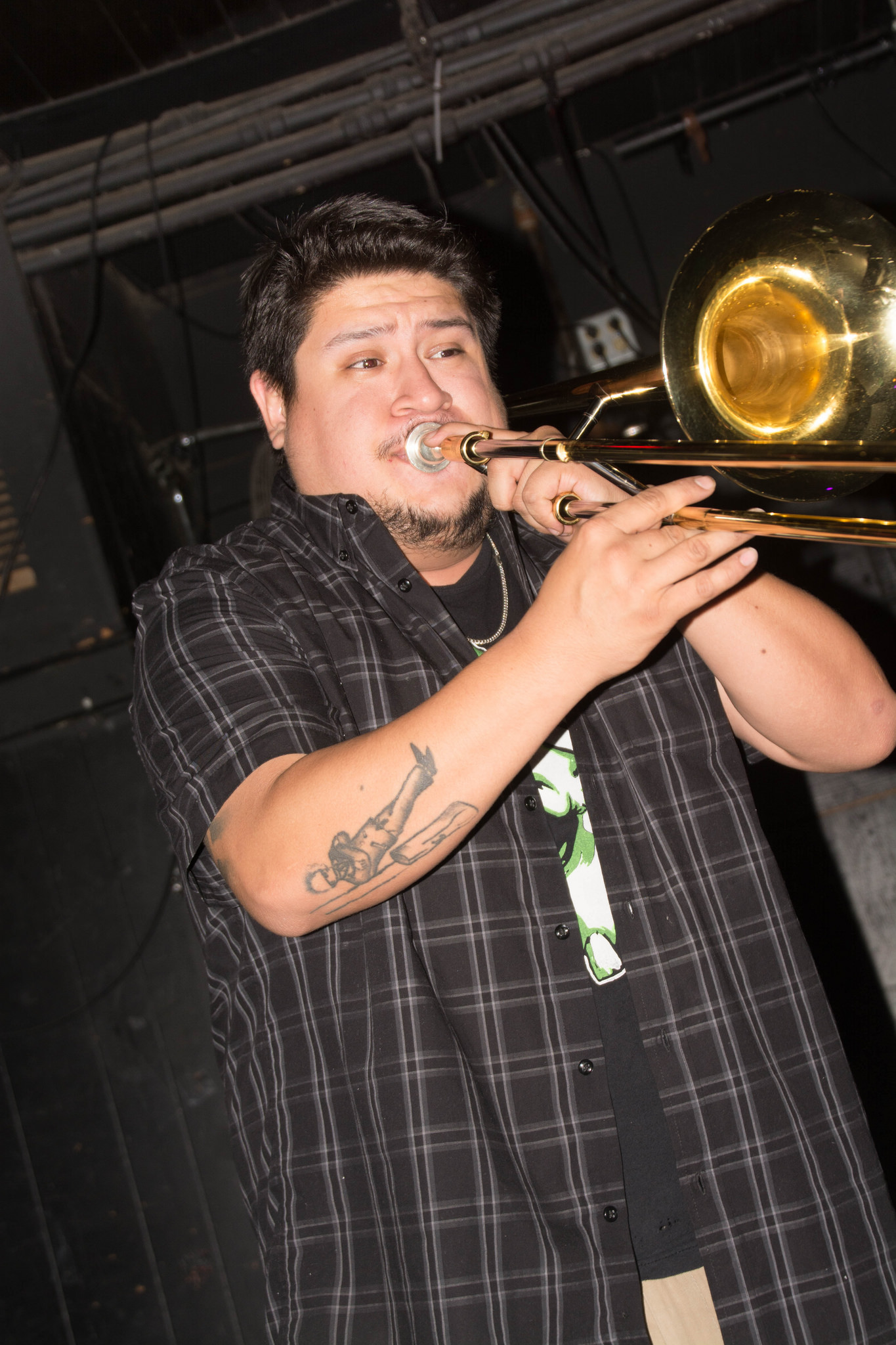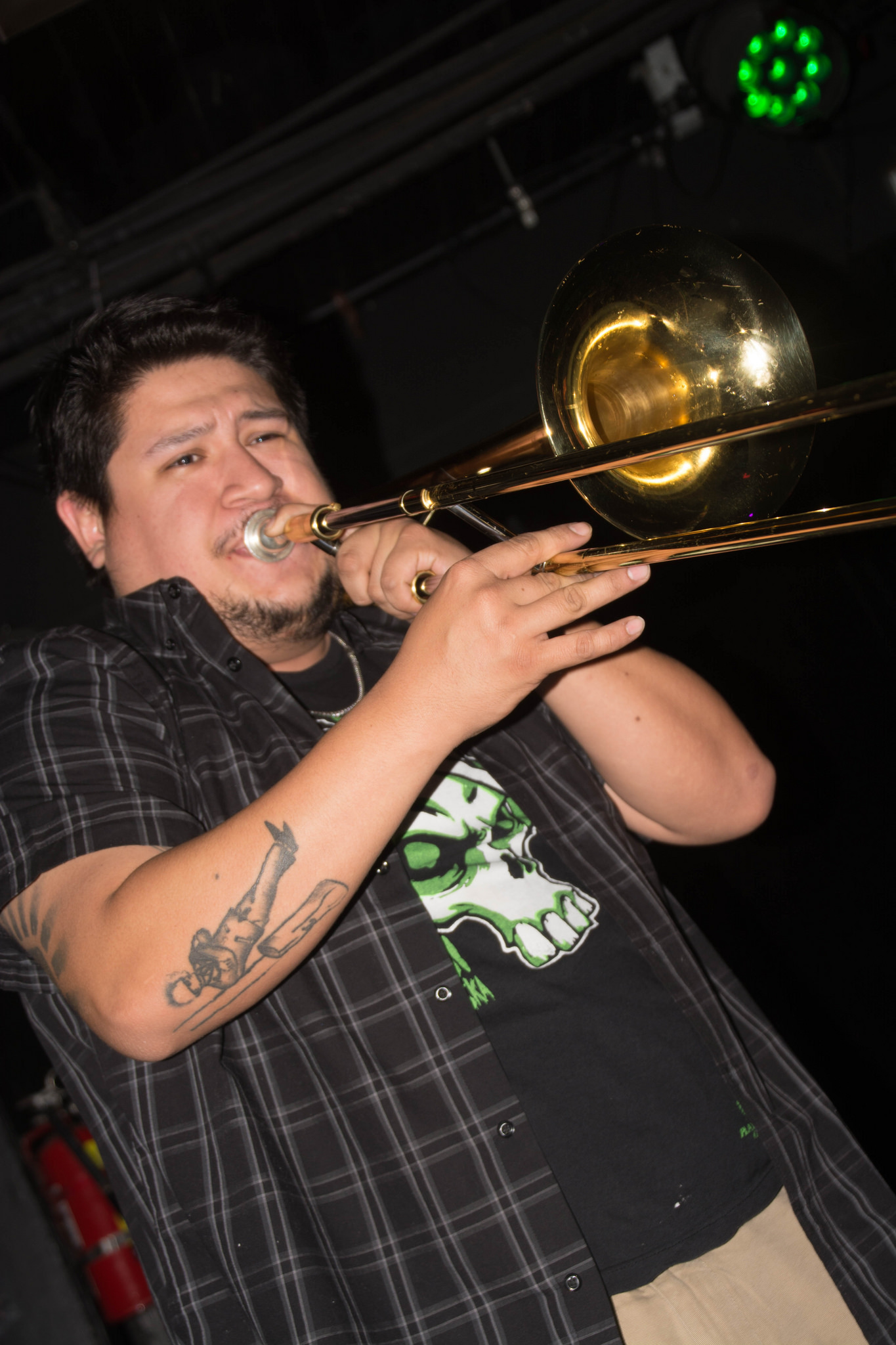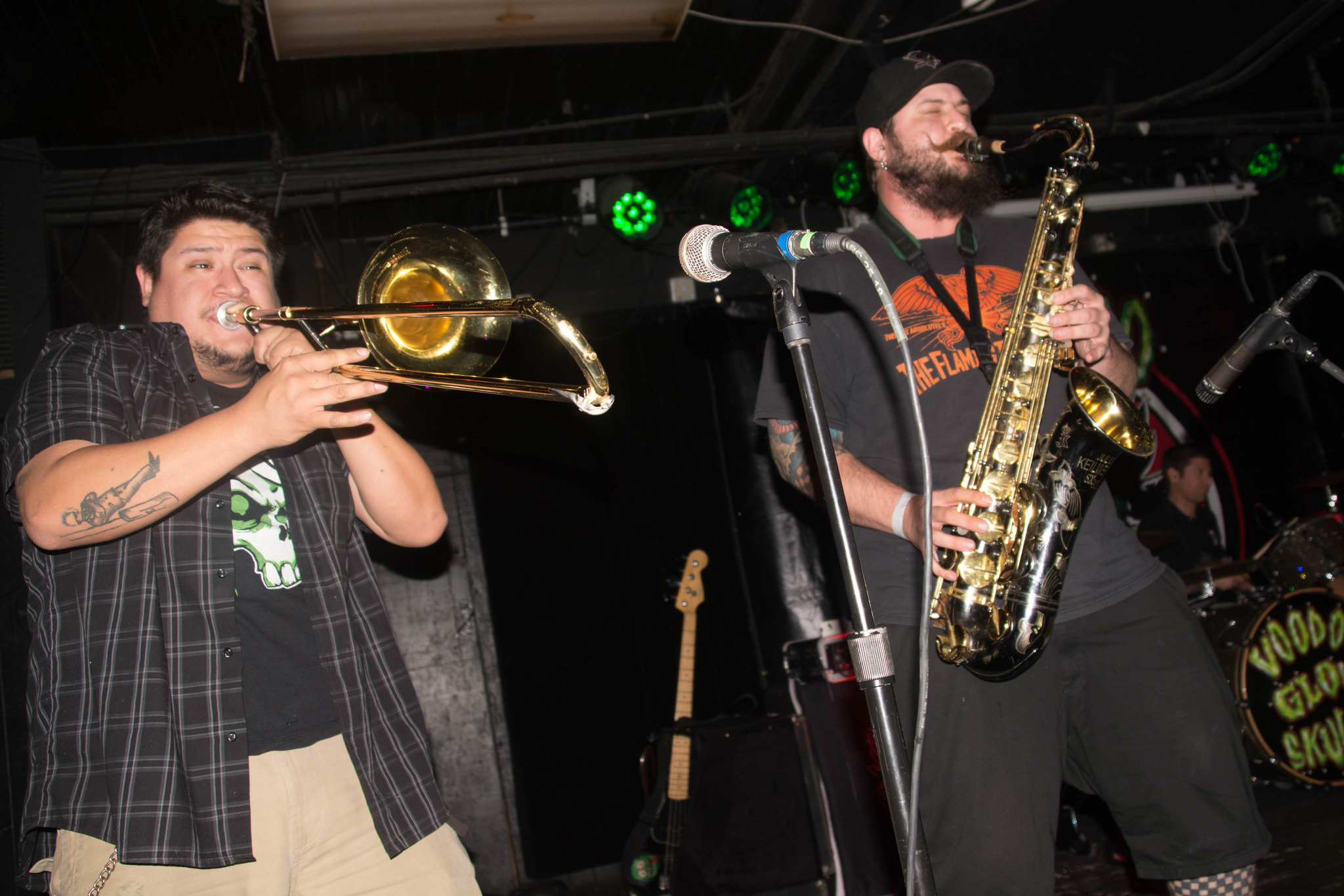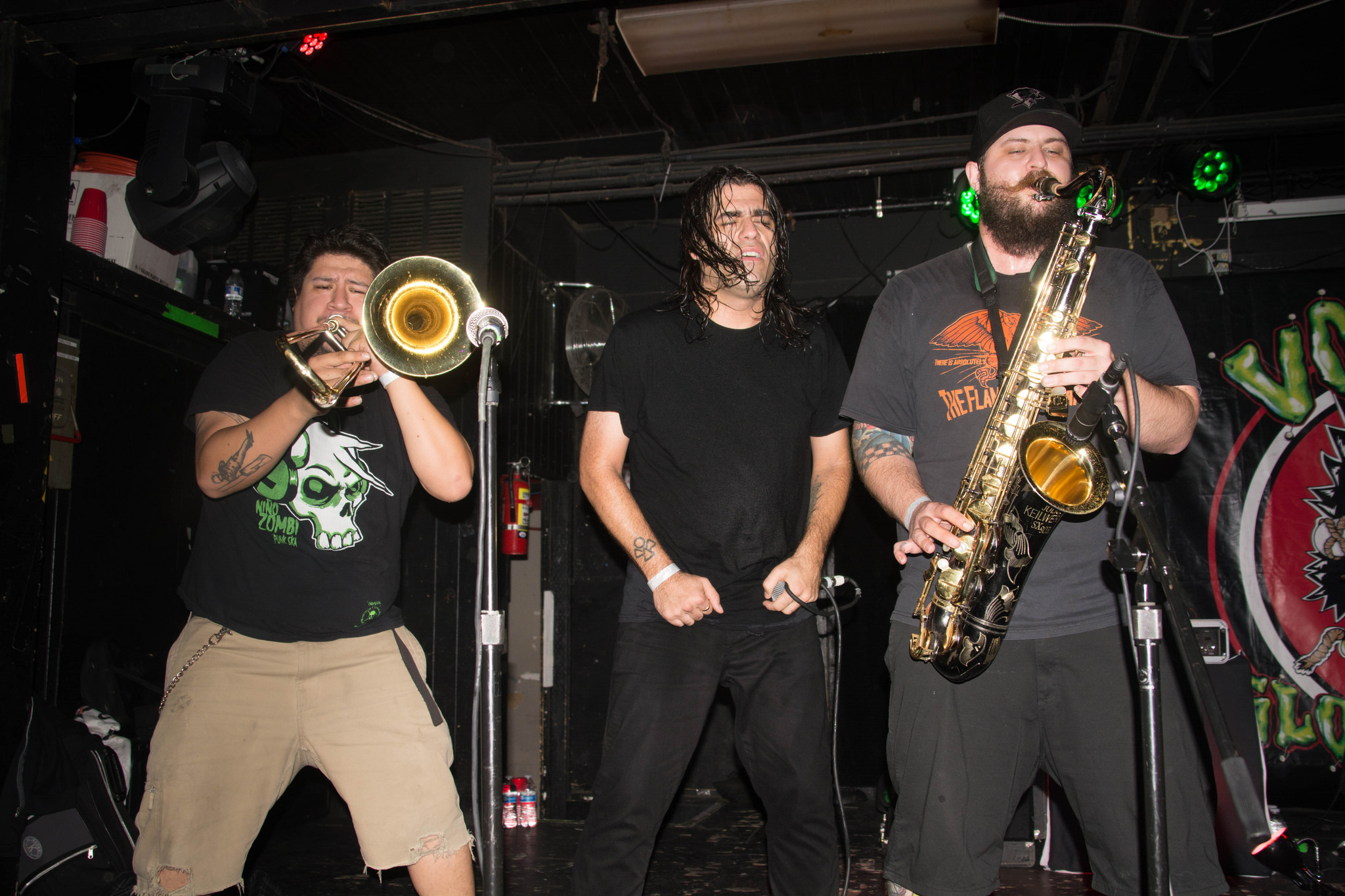 Other songs included Insubordination and Charlie Brown (A cover of the old Coasters’ song) and Efram stuck the mic into the audience, letting everyone yell the line, Why’s everybody always pickin’ on me? This whole band expends tons of energy on stage but mostly let Efram ham it up and ham it up he did. They have an incredible horn section (Eric Fazzini (SKAzzini) on sax and Jose Pazsoldan on trombone). Considering the Skulls’ music is very fast and loud, their skill was nothing short of amazing. This goes for the other members as well. Eddie Casillas – guitar and brother Jorge Casillas – bass guitar, played fast and furious yet barely broke a sweat. A.J. Condosta slammed away like a crazed lunatic, but still looked like he just finished a photo shoot for the cover of Gentleman’s Quarterly.