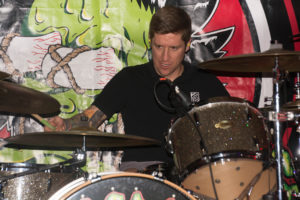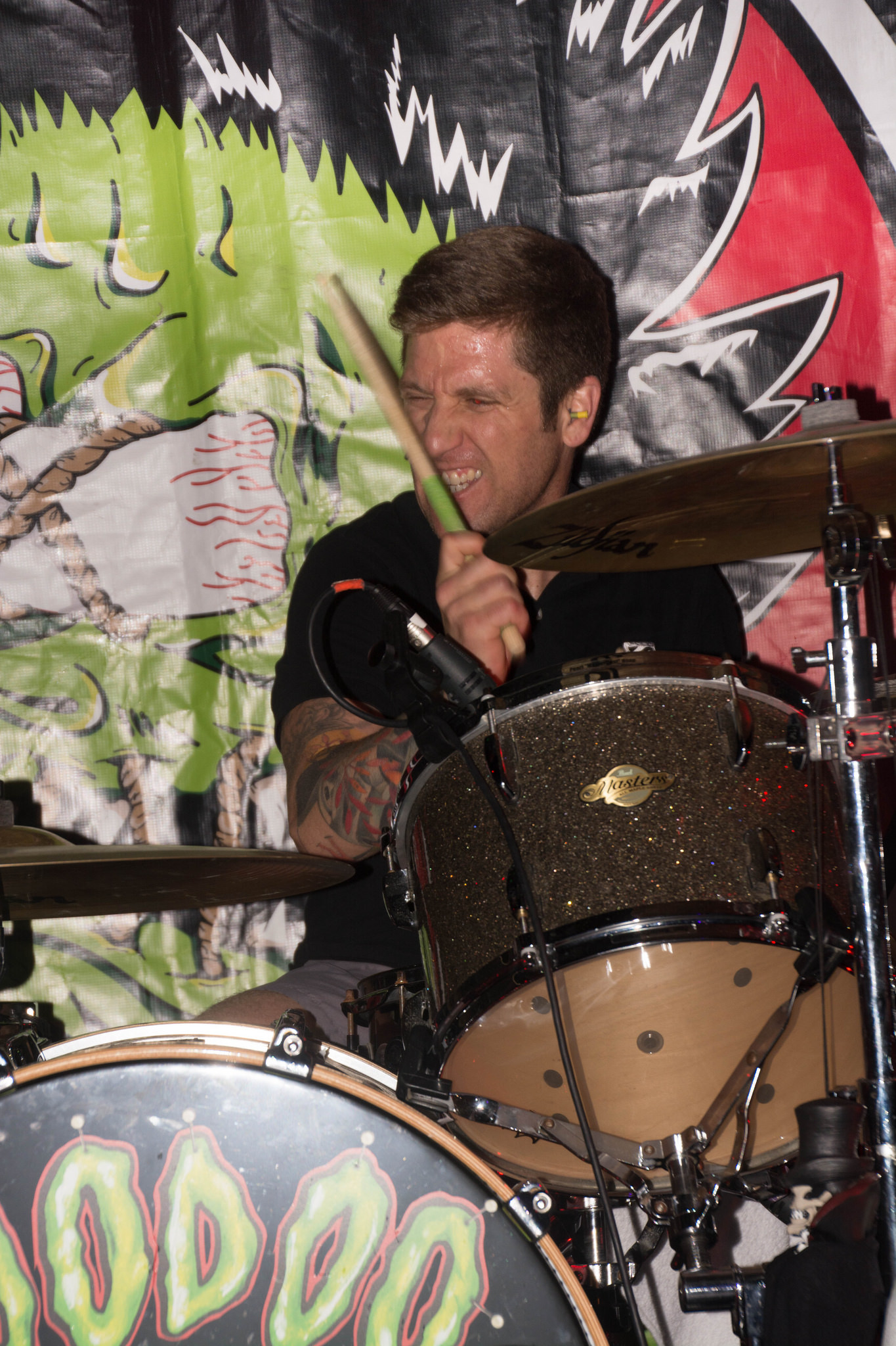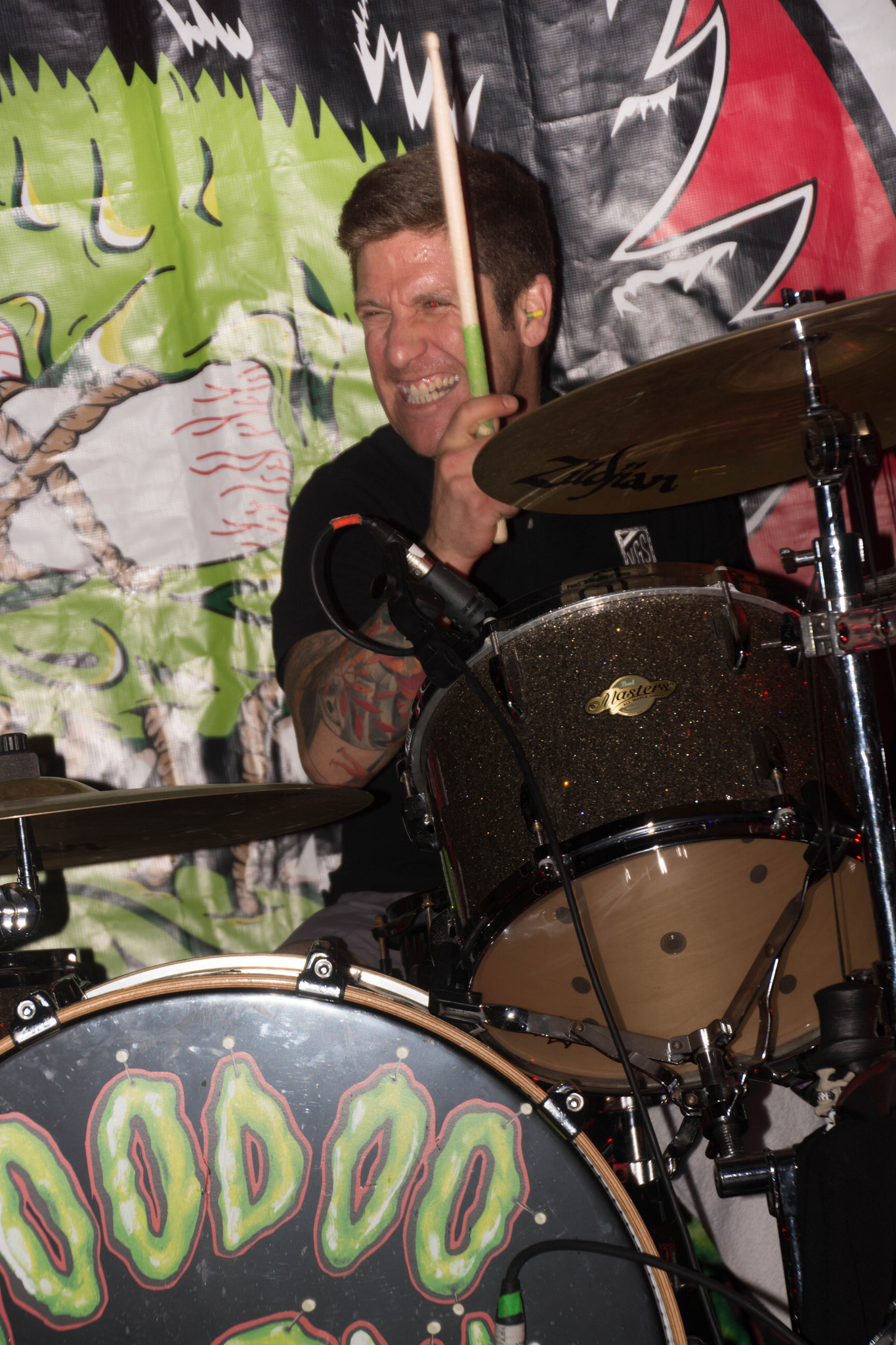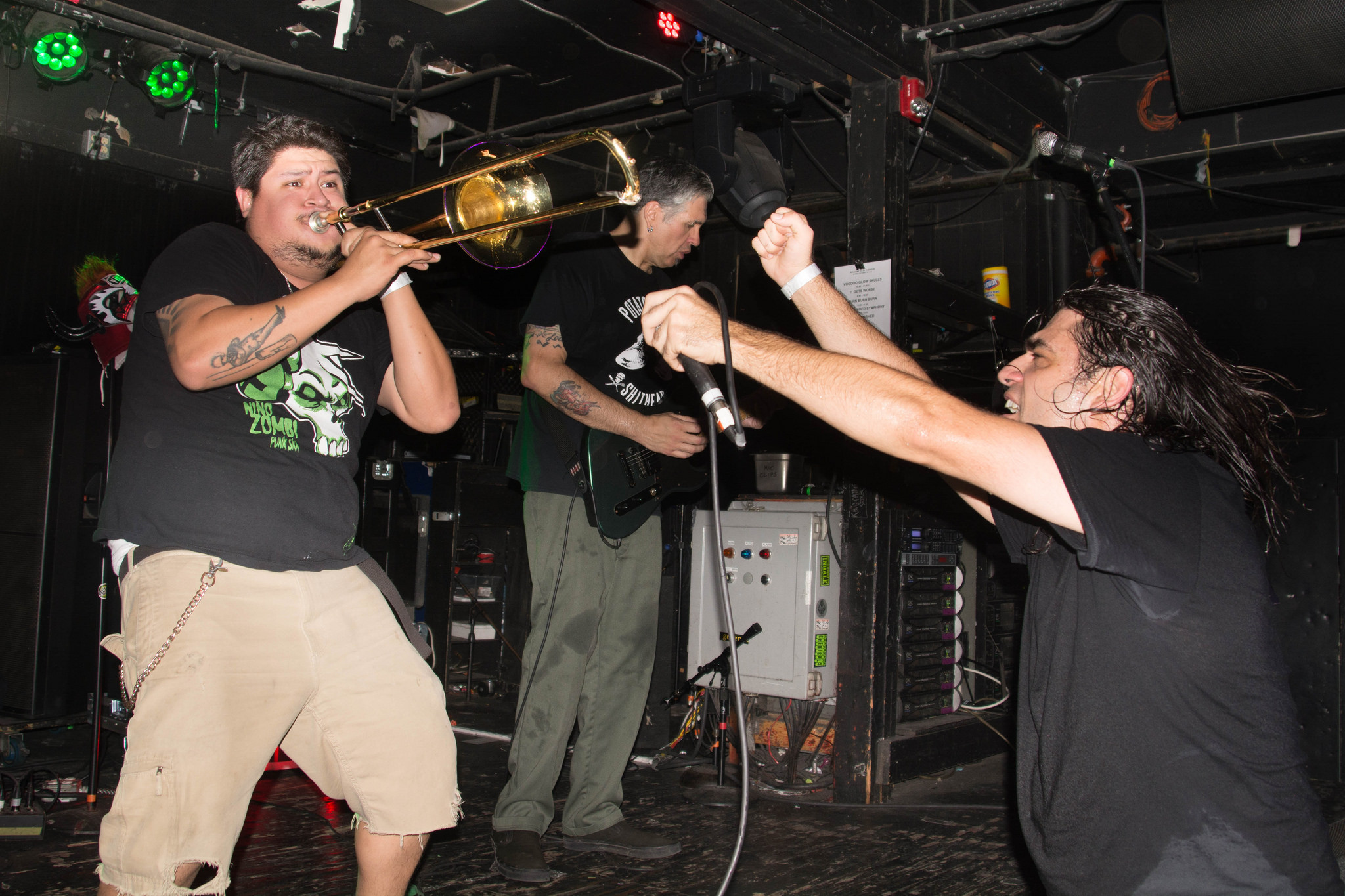 Other songs included Insubordination and Charlie Brown (A cover of the old Coasters’ song) and Efram stuck the mic into the audience, letting everyone yell the line, Why’s everybody always pickin’ on me? This whole band expends tons of energy on stage but mostly let Efram ham it up and ham it up he did. They have an incredible horn section (Eric Fazzini (SKAzzini) on sax and Jose Pazsoldan on trombone). Considering the Skulls’ music is very fast and loud, their skill was nothing short of amazing. This goes for the other members as well. Eddie Casillas – guitar and brother Jorge Casillas – bass guitar, played fast and furious yet barely broke a sweat. A.J. Condosta slammed away like a crazed lunatic, but still looked like he just finished a photo shoot for the cover of Gentleman’s Quarterly.