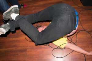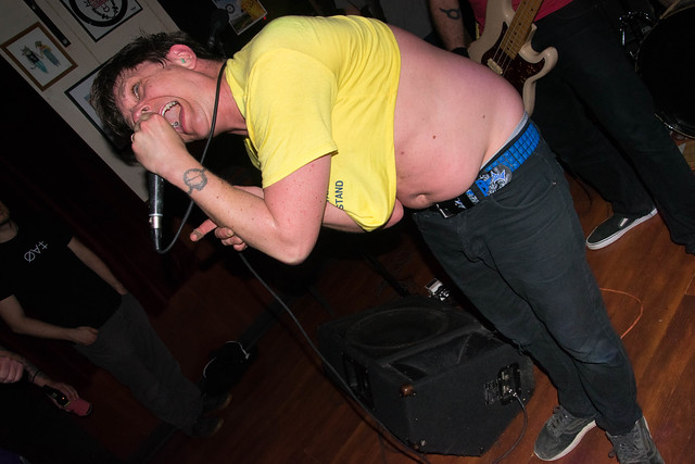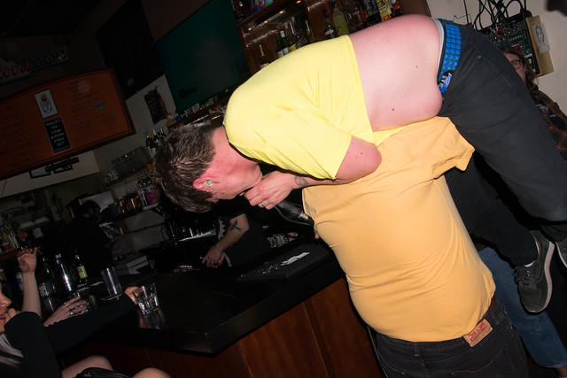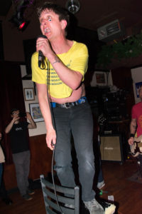 The night was headlined by a California band called the Fleshies. The Fleshies are part rock band and -art physical comedy. There wasn’t a single second when singer (screamer) John No wasn’t writing about on the floor, crawling through the tiny club and even sticking his head up some dude’s shirt. At one point the lead singer for opener Clarko hoisted him up like a sack of potatoes and carried him to the bar before setting him down to crawl all over the club again. The other band members added to the zany and consisted of, Mattowar (gtr), Brian Plastik (bass), Hamiltron (drums), John No (Vocals), Yvan Kawecki (guitar). They were a kick.