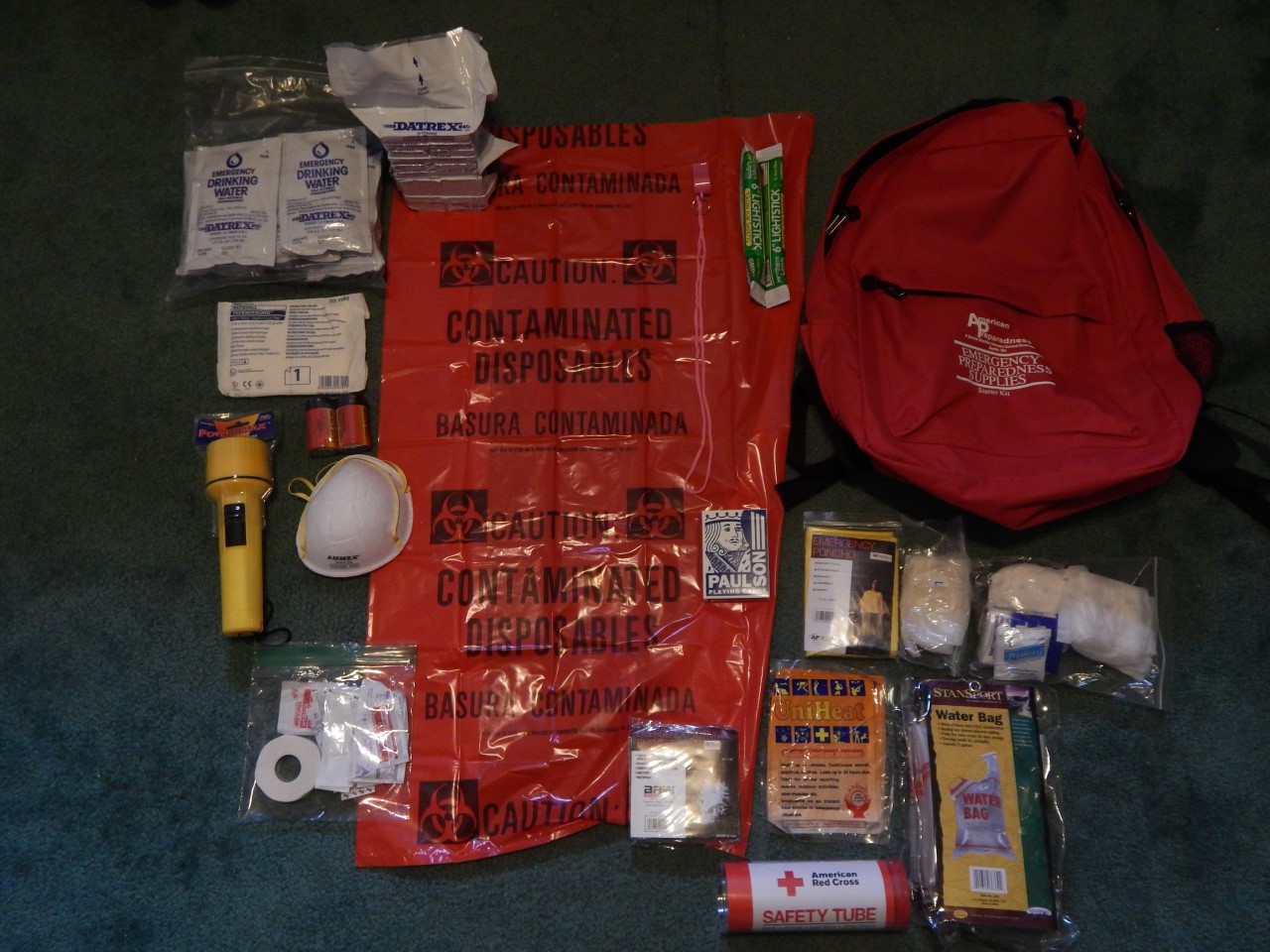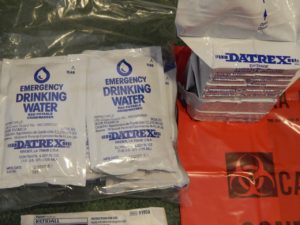 Alcohol rubs, antiseptic toilettes, “triple” antibiotic ointment, two water bags, tape, an “abdominal pad,” a nose/mouth mask similar to what I use during wood projects, a flashlight with batteries, two feminine pads, seven tissues, a deck of cards, a pink whistle, an emergency blanket that weighed less than a quarter of a pound that “reflects body heat,” a rain poncho, one pair of plastic gloves, two light sticks, and a biohazard bag. Boring stuff, I know, but why am I given a biohazard bag coupled with only a small mask and a pair of plastic gloves? Admission: I have never received training on how to dispose of hazardous materials.