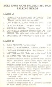 Talking Heads: MORE SONGS ABOUT BUILDINGS AND FOOD (Sire Records, Peru, “Antología Del Rock” cassette tape reissue, released during mid-1990s)
