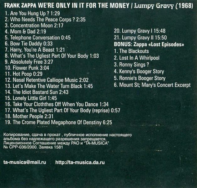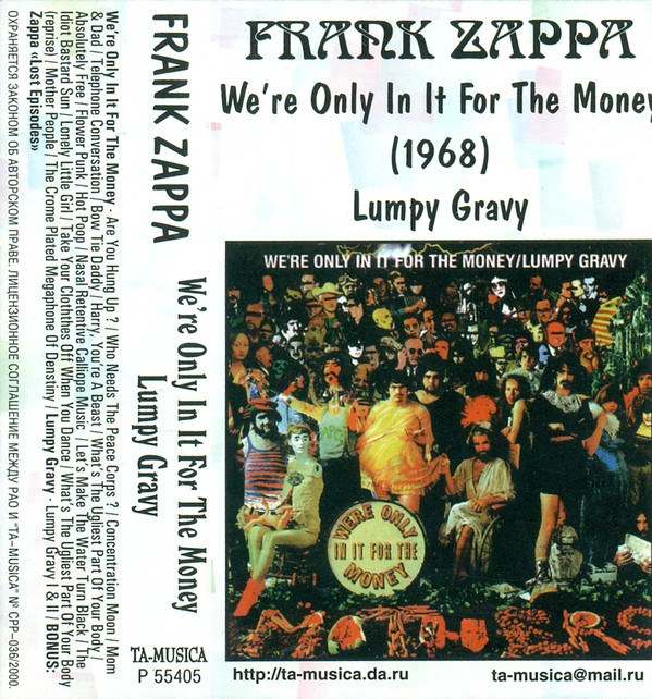 Frank Zappa: WE’RE ONLY IN IT FOR THE MONEY/LUMPY GRAVY (TA-MUSICA Records, Russia, cassette tape reissue w/ LUMPY GRAVY album and six additional bonus cuts, unofficial release, 2000)