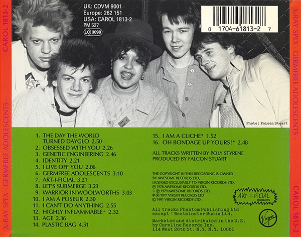 X-Ray Spex: GERMFREE ADOLESCENTS (Virgin Records/Art-I-Ficial Products/Caroline Records, UK/Europe/US, re-sequenced cassette tape reissue w/ 4 bonus cuts, 1991)
