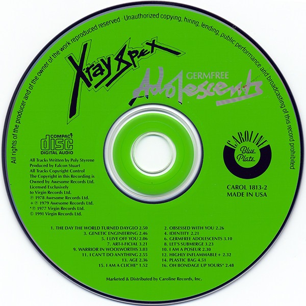 X-Ray Spex: GERMFREE ADOLESCENTS (Caroline Blue Plate, US, re-sequenced compact disc reissue w/ 4 bonus cuts, 1991)