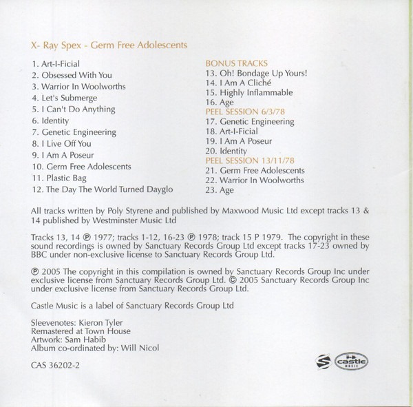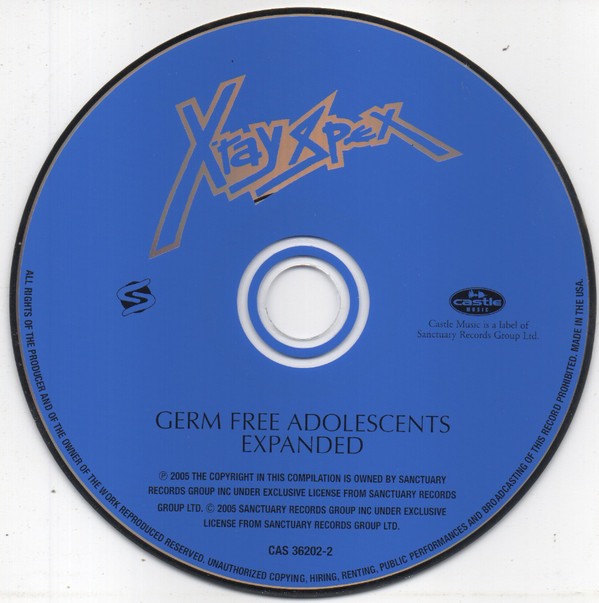 X-Ray Spex: GERMFREE ADOLESCENTS EXPANDED (Castle Music, US, definitive compact disc reissue w/ 11 bonus cuts, including both Peel Sessions, 2005)