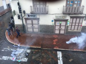 My first instinct should have been to turn around and run away from the plaza, like everyone else, screaming and covering their mouths. The old, indigenous woman, with the multiple petticoats and black pork pie hat, sitting at her usual location half-way up the block, from whom I normally bought a newspaper every day, suddenly bent over and vomited. Moments before, I had heard a “pop”, “pop” and saw white, billowing clouds of smoke. A young Ecuatoriano adult, running in a hooded sweatshirt, gave a sudden yelp and stumbled, after getting hit in the leg with one of the tear gas canisters.