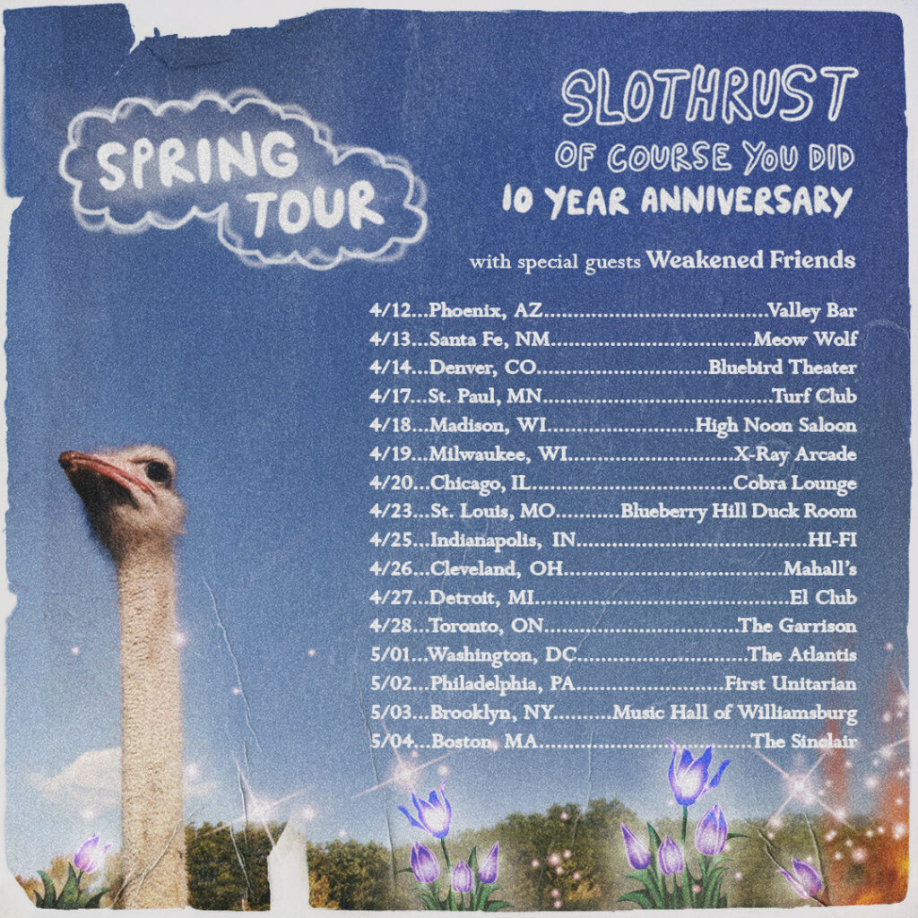 In addition to their new EP release, Slothrust is about to embark on a tour in celebration of the 10-Year Anniversary of their release, Of Course You Do. Today, the duo announces a second leg of the tour, with continued support from Weakened Friends (tickets on sale Friday, January 19 at 10 AM Local).View the full list of dates below and find more information HERE.